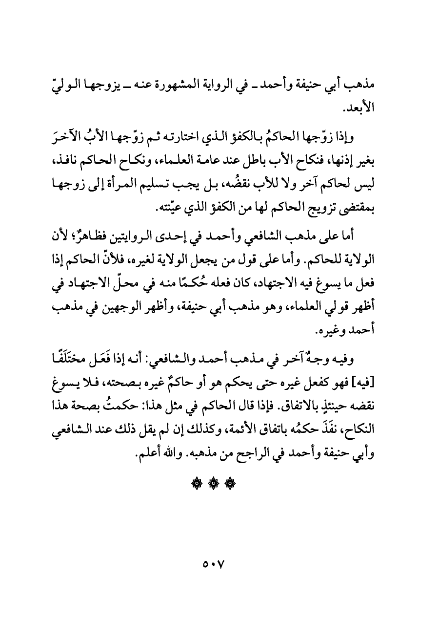 وفيه وجهٌ آخر في مذهب أحمد والشافعي: أنه إذا فَعَل مختَلَفًا [فيه] فهو كفعل غيره حتى يحكم هو أو حاكمٌ غيره بصحته، فلا يسوغ نقضه حينئذٍ بالاتفاق. فإذا قال الحاكم في مثل هذا: حكمتُ بصحة هذا النكاح، نفَذَ حكمُه باتفاق الأئمة، وكذلك إن لم يقل ذلك عند الشافعي وأبي حنيفة وأحمد في الراجح من مذهبه. والله أعلم.