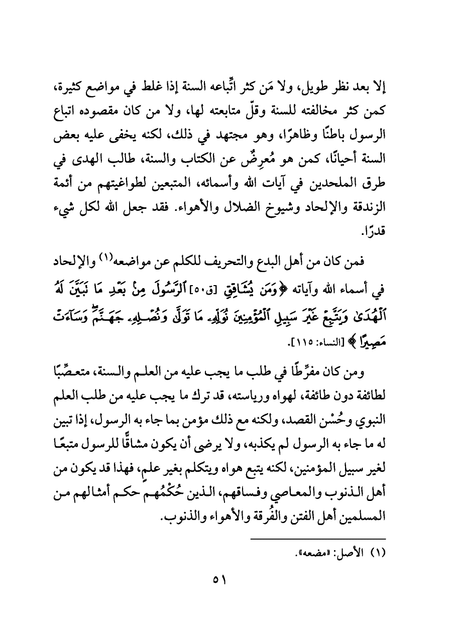 فمن كان من أهل البدع والتحريف للكلم عن مواضعه (¬١) والإلحاد في أسماء الله وآياته {وَمَنْ يُشَاقِقِ [ق ٥٠] الرَّسُولَ مِنْ بَعْدِ مَا تَبَيَّنَ لَهُ الْهُدَى وَيَتَّبِعْ غَيْرَ سَبِيلِ الْمُؤْمِنِينَ نُوَلِّهِ مَا تَوَلَّى وَنُصْلِهِ جَهَنَّمَ وَسَاءَتْ مَصِيرًا} [النساء: ١١٥].