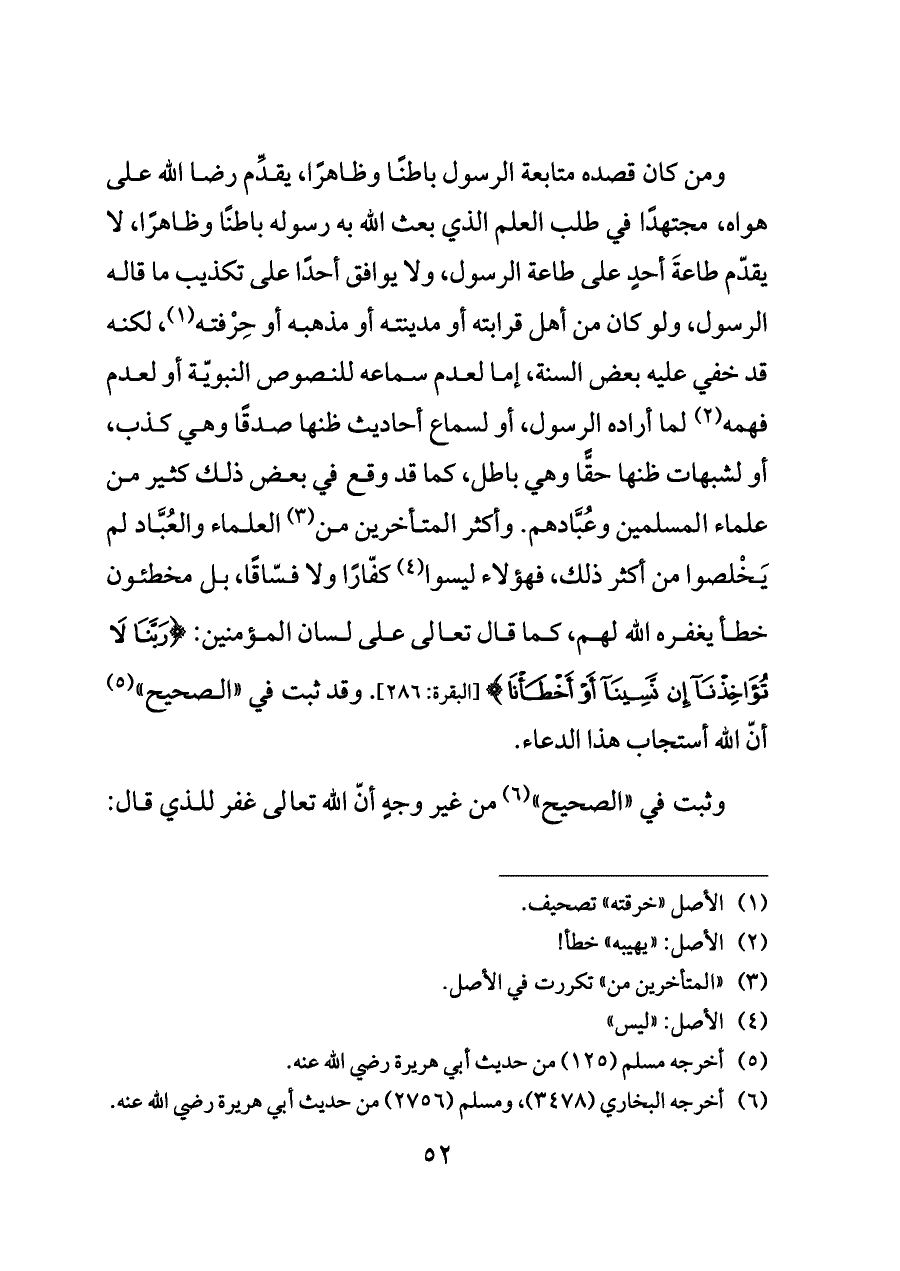 ومن كان قصده متابعة الرسول باطنًا وظاهرًا، يقدِّم رضا الله على هواه، مجتهدًا في طلب العلم الذي بعث الله به رسوله باطنًا وظاهرًا، لا يقدّم طاعةَ أحدٍ على طاعة الرسول، ولا يوافق أحدًا على تكذيب ما قاله الرسول، ولو كان من أهل قرابته أو مدينته أو مذهبه أو حِرْفته (¬١)، لكنه قد خفي عليه بعض السنة، إما لعدم سماعه للنصوص النبويّة أو لعدم فهمه (¬٢) لما أراده الرسول، أو لسماع أحاديث ظنها صدقًا وهي كذب، أو لشبهات ظنها حقًّا وهي باطل، كما قد وقع في بعض ذلك كثير من علماء المسلمين وعُبَّادهم. وأكثر المتأخرين من (¬٣) العلماء والعُبَّاد لم يَخْلصوا من أكثر ذلك، فهؤلاء ليسوا (¬٤) كفّارًا ولا فسّاقًا، بل مخطئون خطأ يغفره الله لهم، كما قال تعالى على لسان المؤمنين: {رَبَّنَا لَا تُؤَاخِذْنَا إِنْ نَسِينَا أَوْ أَخْطَأْنَا} [البقرة: ٢٨٦]. وقد ثبت في «الصحيح» (¬٥) أنّ الله أستجاب هذا الدعاء.