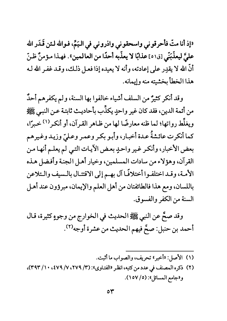 «إذ أنا متّ فأحرقوني واسحقوني واذروني في اليَمِّ، فوالله لئن قَدَر الله عليَّ ليعذّبَنّي [ق ٥١] عذابًا لا يعذّبه أحدًا من العالمين». فهذا مؤمنٌ ظنّ أنّ الله لا يقدِر على إعادته، وأنه لا يعيده إذا فعل ذلك، وقد غفر الله له هذا الخطأ بخشيته منه وإيمانه.