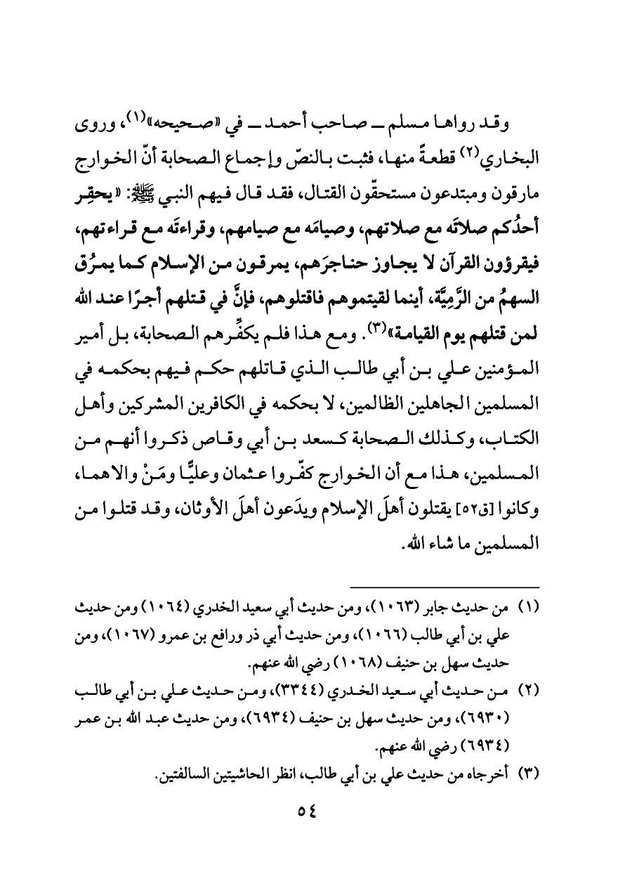 وقد رواها مسلم ــ صاحب أحمد ــ في «صحيحه» (¬١)، وروى البخاري (¬٢) قطعةً منها، فثبت بالنصّ وإجماع الصحابة أنّ الخوارج مارقون ومبتدعون مستحقّون القتال، فقد قال فيهم النبي - صلى الله عليه وسلم -: «يحقِر أحدُكم صلاتَه مع صلاتهم، وصيامَه مع صيامهم، وقراءتَه مع قراءتهم، فيقرؤون القرآن لا يجاوز حناجرَهم، يمرقون من الإسلام كما يمرُق السهمُ من الرَّمِيَّة، أينما لقيتموهم فاقتلوهم، فإنَّ في قتلهم أجرًا عند الله لمن قتلهم يوم القيامة» (¬٣). ومع هذا فلم يكفِّرهم الصحابة، بل أمير المؤمنين علي بن أبي طالب الذي قاتلهم حكم فيهم بحكمه في المسلمين الجاهلين الظالمين، لا بحكمه في الكافرين المشركين وأهل الكتاب، وكذلك الصحابة كسعد بن أبي وقاص ذكروا أنهم من المسلمين، هذا مع أن الخوارج كفّروا عثمان وعليًّا ومَنْ والاهما، وكانوا [ق ٥٢] يقتلون أهلَ الإسلام ويدَعون أهلَ الأوثان، وقد قتلوا من المسلمين ما شاء الله.