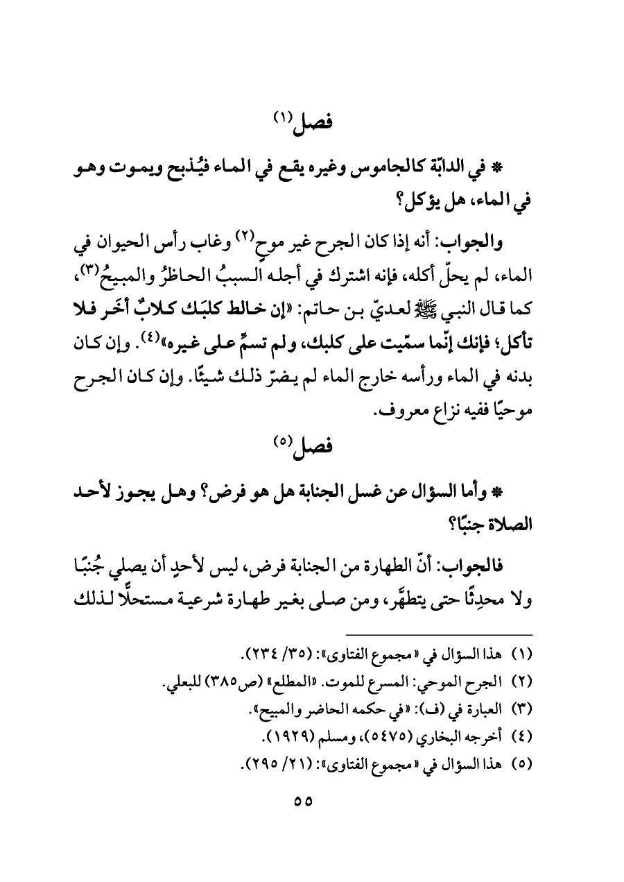 والجواب: أنه إذا كان الجرح غير موحٍ (¬٢) وغاب رأس الحيوان في الماء، لم يحلّ أكله، فإنه اشترك في أجله السببُ الحاظرُ والمبيحُ (¬٣)، كما قال النبي - صلى الله عليه وسلم - لعديّ بن حاتم: «إن خالط كلبَك كلابٌ أخَر فلا تأكل؛ فإنك إنّما سمّيت على كلبك، ولم تسمِّ على غيره» (¬٤). وإن كان بدنه في الماء ورأسه خارج الماء لم يضرّ ذلك شيئًا. وإن كان الجرح موحيًا ففيه نزاع معروف.
