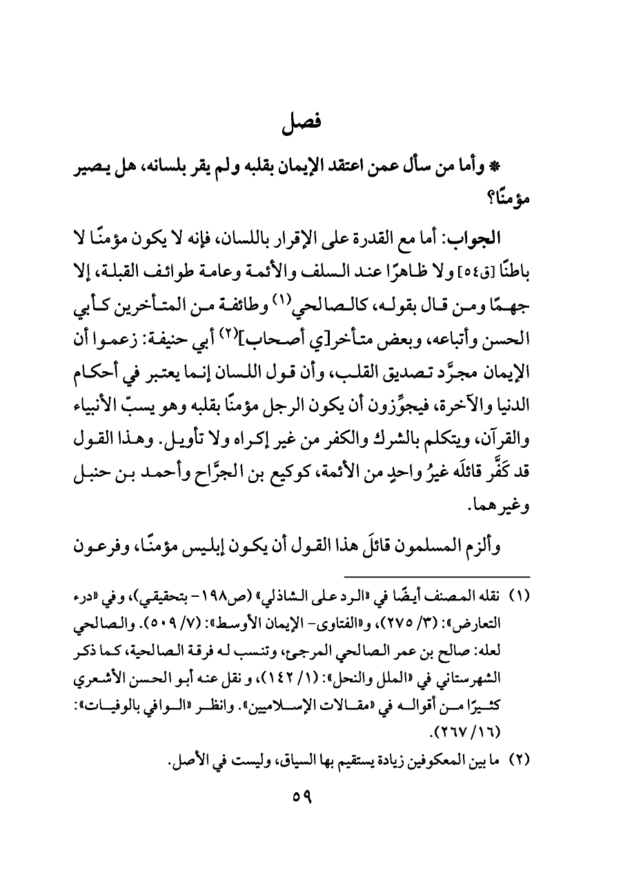 (¬١) نقله المصنف أيضًا في «الرد على الشاذلي» (ص ١٩٨ - بتحقيقي)، وفي «درء التعارض»: (٣/ ٢٧٥)، و «الفتاوى- الإيمان الأوسط»: (٧/ ٥٠٩). والصالحي لعله: صالح بن عمر الصالحي المرجئ، وتنسب له فرقة الصالحية، كما ذكر الشهرستاني في «الملل والنحل»: (١/ ١٤٢)، و نقل عنه أبو الحسن الأشعري كثيرًا من أقواله في «مقالات الإسلاميين». وانظر «الوافي بالوفيات»: (١٦/ ٢٦٧).