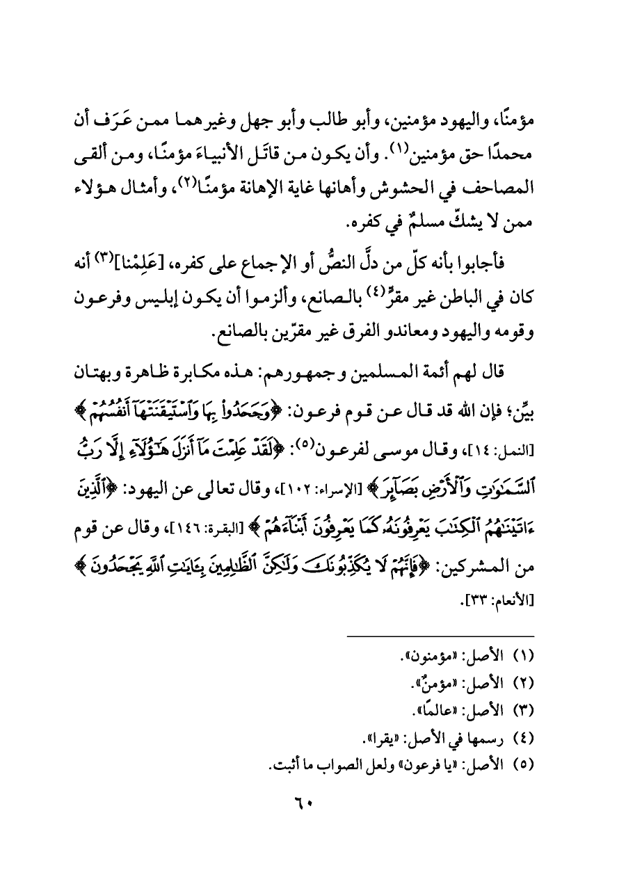 مؤمنًا، واليهود مؤمنين، وأبو طالب وأبو جهل وغيرهما ممن عَرَف أن محمدًا حق مؤمنين (¬١). وأن يكون من قاتَل الأنبياءَ مؤمنًا، ومن ألقى المصاحف في الحشوش وأهانها غاية الإهانة مؤمنًا (¬٢)، وأمثال هؤلاء ممن لا يشكّ مسلمٌ في كفره.