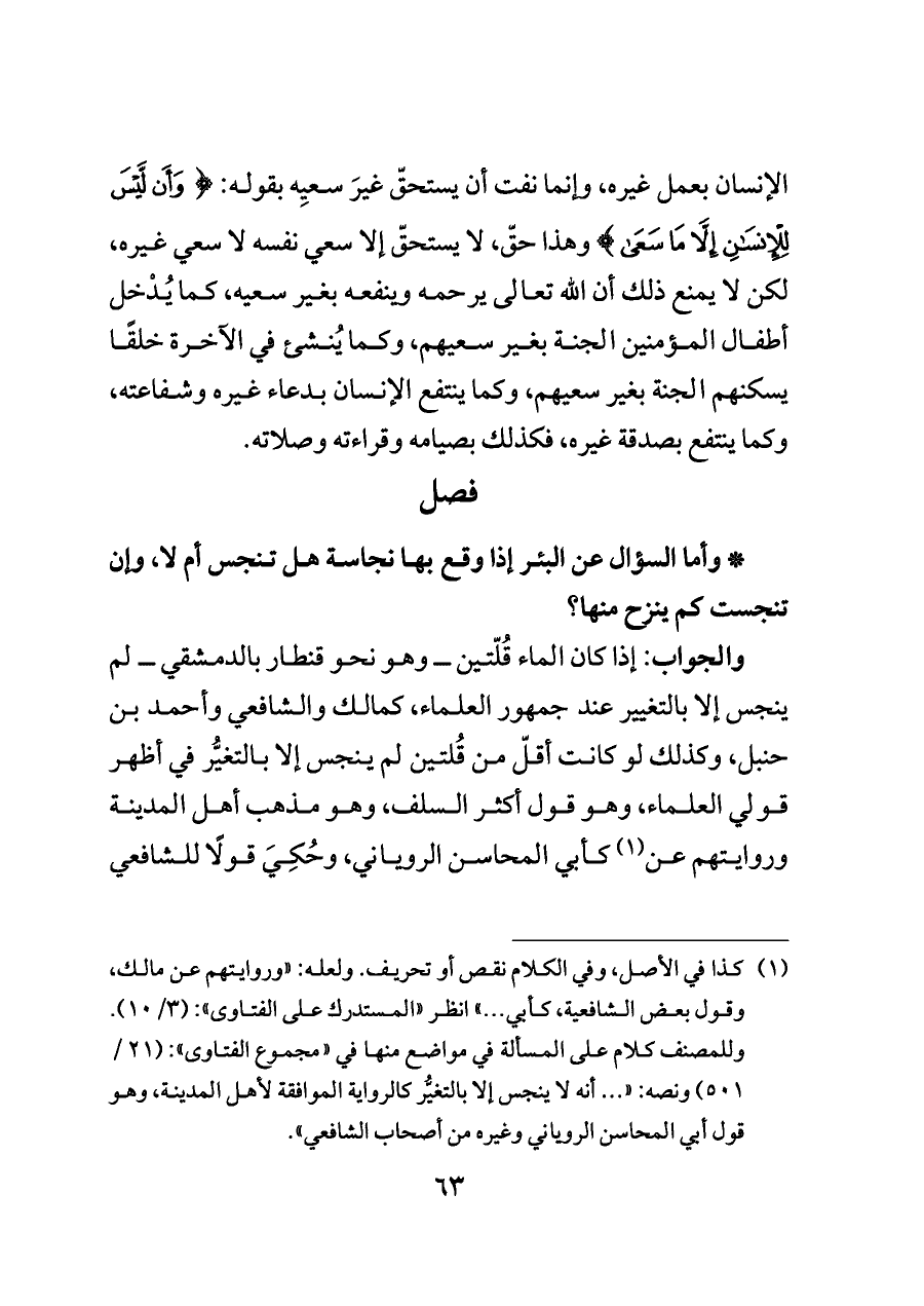 والجواب: إذا كان الماء قُلّتين ــ وهو نحو قنطار بالدمشقي ــ لم ينجس إلا بالتغيير عند جمهور العلماء، كمالك والشافعي وأحمد بن حنبل، وكذلك لو كانت أقلّ من قُلتين لم ينجس إلا بالتغيُّر في أظهر قولي العلماء، وهو قول أكثر السلف، وهو مذهب أهل المدينة وروايتهم عن (¬١) كأبي المحاسن الروياني، وحُكِيَ قولًا للشافعي
