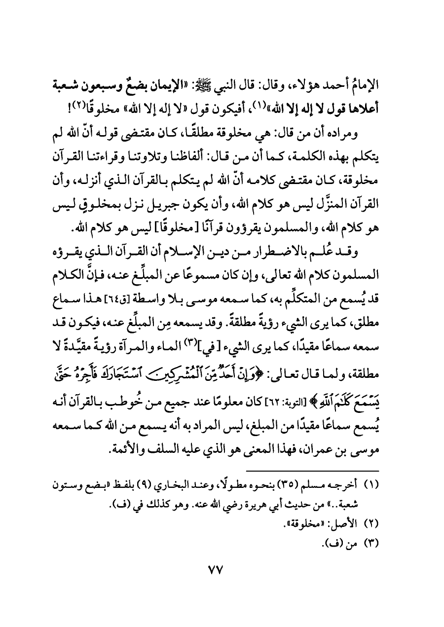 ومراده أن من قال: هي مخلوقة مطلقًا، كان مقتضى قوله أنّ الله لم يتكلم بهذه الكلمة، كما أن من قال: ألفاظنا وتلاوتنا وقراءتنا القرآن مخلوقة، كان مقتضى كلامه أنّ الله لم يتكلم بالقرآن الذي أنزله، وأن القرآن المنزَّل ليس هو كلام الله، وأن يكون جبريل نزل بمخلوقٍ ليس هو كلام الله، والمسلمون يقرؤون قرآ نًا [مخلوقًا] ليس هو كلام الله.