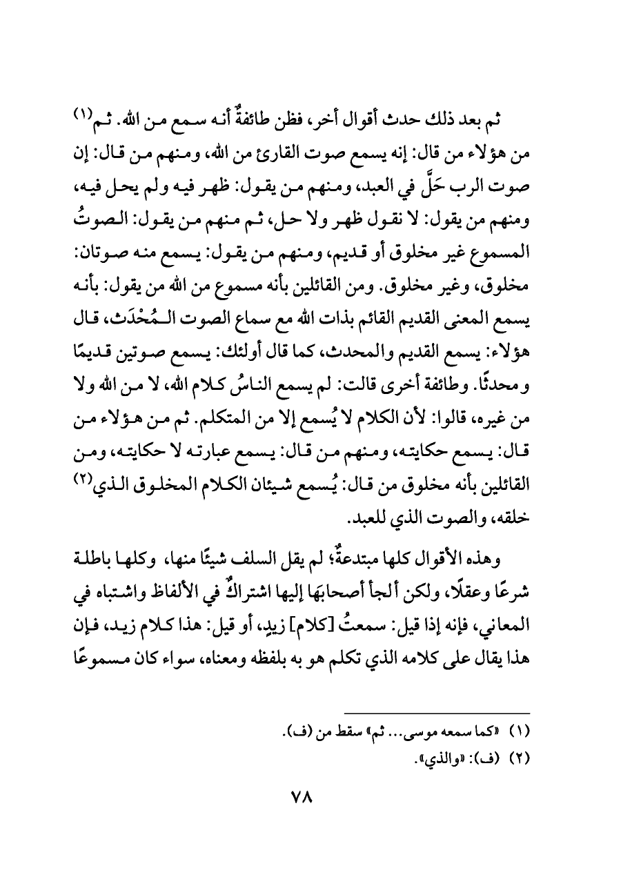 ثم بعد ذلك حدث أقوال أخر، فظن طائفةٌ أنه سمع من الله. ثم (¬١) من هؤلاء من قال: إنه يسمع صوت القارئ من الله، ومنهم من قال: إن صوت الرب حَلَّ في العبد، ومنهم من يقول: ظهر فيه ولم يحل فيه، ومنهم من يقول: لا نقول ظهر ولا حل، ثم منهم من يقول: الصوتُ المسموع غير مخلوق أو قديم، ومنهم من يقول: يسمع منه صوتان: مخلوق، وغير مخلوق. ومن القائلين بأنه مسموع من الله من يقول: بأنه يسمع المعنى القديم القائم بذات الله مع سماع الصوت المُحْدَث، قال هؤلاء: يسمع القديم والمحدث، كما قال أولئك: يسمع صوتين قديمًا ومحدثًا. وطائفة أخرى قالت: لم يسمع الناسُ كلام الله، لا من الله ولا من غيره، قالوا: لأن الكلام لا يُسمع إلا من المتكلم. ثم من هؤلاء من قال: يسمع حكايته، ومنهم من قال: يسمع عبارته لا حكايته، ومن القائلين بأنه مخلوق من قال: يُسمع شيئان الكلام المخلوق الذي (¬٢) خلقه، والصوت الذي للعبد.