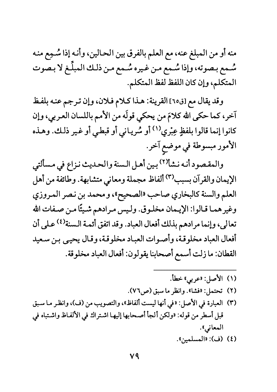 وقد يقال مع [ق ٦٥] القرينة: هذا كلام فلان، وإن ترجم عنه بلفظ آخر، كما حكى الله كلامَ من يحكي قولَه من الأمم باللسان العربي، وإن كانوا إنما قالوا بلفظٍ عِبْري (¬١) أو سُرياني أو قبطي أو غير ذلك. وهذه الأمور مبسوطة في موضعٍ آخر.