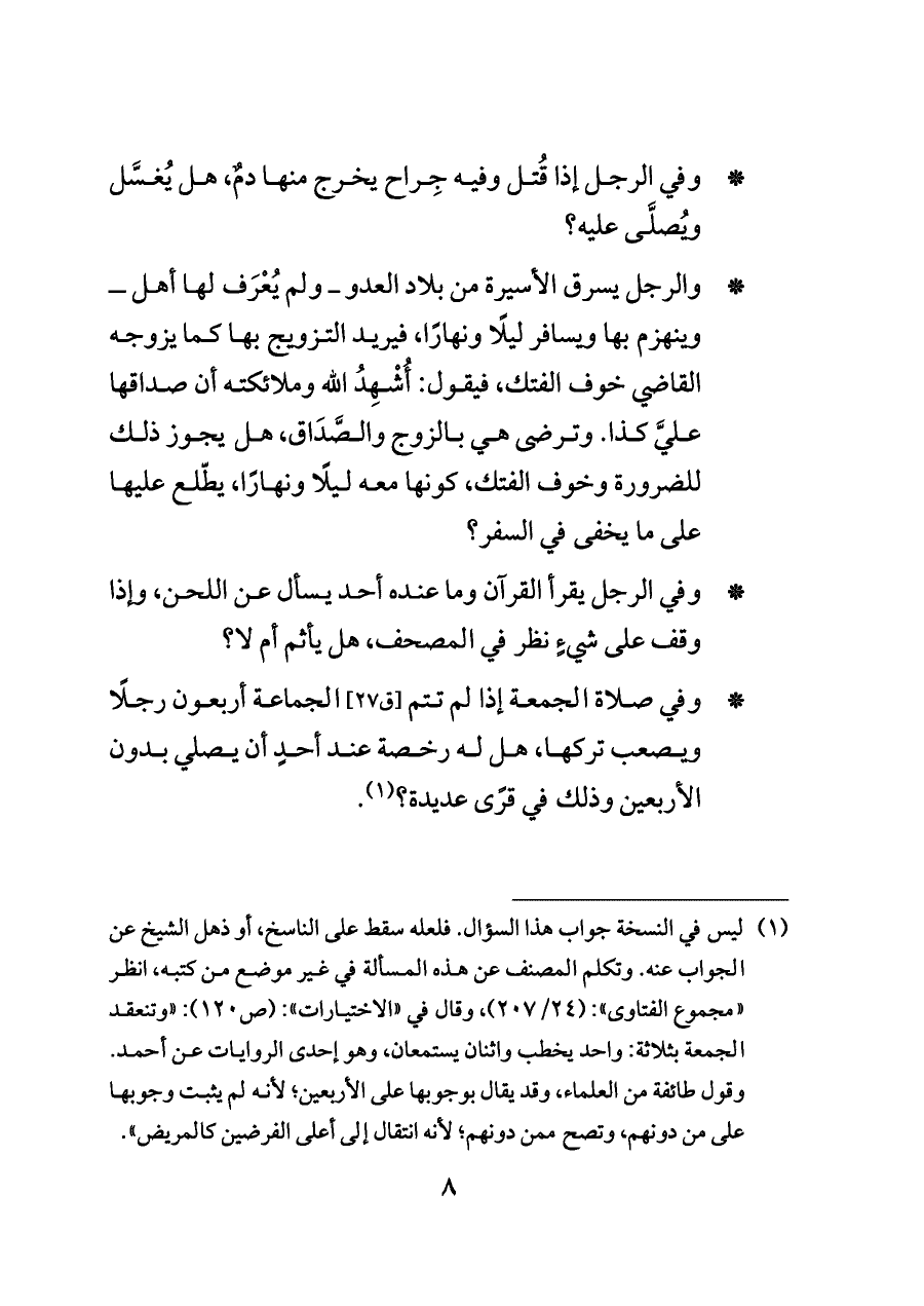 (¬١) ليس في النسخة جواب هذا السؤال. فلعله سقط على الناسخ، أو ذهل الشيخ عن الجواب عنه. وتكلم المصنف عن هذه المسألة في غير موضع من كتبه، انظر «مجموع الفتاوى»: (٢٤/ ٢٠٧)، وقال في «الاختيارات»: (ص ١٢٠): «وتنعقد الجمعة بثلاثة: واحد يخطب واثنان يستمعان، وهو إحدى الروايات عن أحمد. وقول طائفة من العلماء، وقد يقال بوجوبها على الأربعين؛ لأنه لم يثبت وجوبها على من دونهم، وتصح ممن دونهم؛ لأنه انتقال إلى أعلى الفرضين كالمريض».