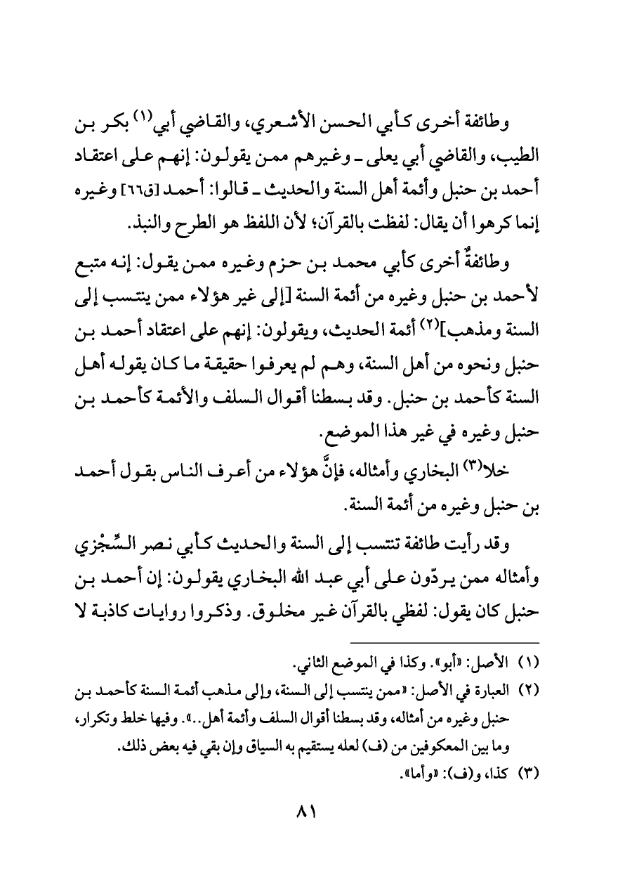 وقد رأيت طائفة تنتسب إلى السنة والحديث كأبي نصر السِّجْزي وأمثاله ممن يردّون على أبي عبد الله البخاري يقولون: إن أحمد بن حنبل كان يقول: لفظي بالقرآن غير مخلوق. وذكروا روايات كاذبة لا