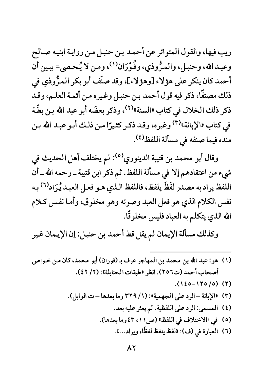 ريب فيها، والقول المتواتر عن أحمد بن حنبل من رواية ابنيه صالح وعبد الله، وحنبل، والمرُّوذي، وفُوْرَان (¬١)، ومن لا يُحصى= يبين أن أحمد كان ينكر على هؤلاء [وهؤلاء]، وقد صنّف أبو بكر المرُّوذي في ذلك مصنفًا، ذكر فيه قول أحمد بن حنبل وغيره من أئمة العلم، وقد ذكر ذلك الخلال في كتاب «السنة» (¬٢)، وذكر بعضَه أبو عبد الله بن بطّة في كتاب «الإبانة» (¬٣) وغيره، وقد ذكر كثيرًا من ذلك أبو عبد الله بن منده فيما صنفه في مسألة اللفظ (¬٤).