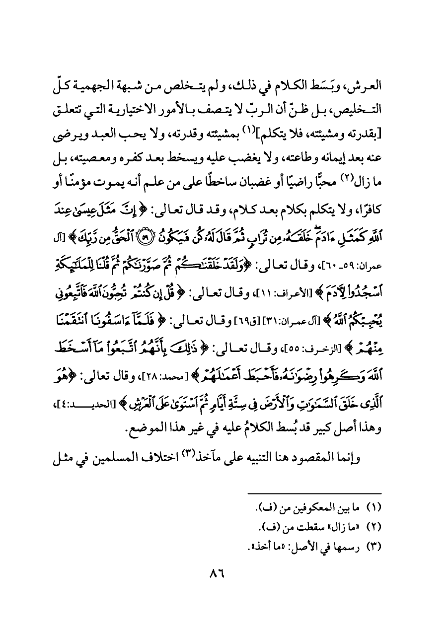 العرش، وبَسَط الكلام في ذلك، ولم يتخلص من شبهة الجهمية كلّ التخليص، بل ظنّ أن الربّ لا يتصف بالأمور الاختيارية التي تتعلق [بقدرته ومشيئته، فلا يتكلم] (¬١) بمشيئته وقدرته، ولا يحب العبد ويرضى عنه بعد إيمانه وطاعته، ولا يغضب عليه ويسخط بعد كفره ومعصيته، بل ما زال (¬٢) محبًّا راضيًا أو غضبان ساخطًا على من علم أنه يموت مؤمنًا أو كافرًا، ولا يتكلم بكلام بعد كلام، وقد قال تعالى: {إِنَّ مَثَلَ عِيسَى عِنْدَ اللَّهِ كَمَثَلِ آدَمَ خَلَقَهُ مِنْ تُرَابٍ ثُمَّ قَالَ لَهُ كُنْ فَيَكُونُ (٥٩) الْحَقُّ مِنْ رَبِّكَ} [آل عمران: ٥٩ ــ ٦٠]، وقال تعالى: {وَلَقَدْ خَلَقْنَاكُمْ ثُمَّ صَوَّرْنَاكُمْ ثُمَّ قُلْنَا لِلْمَلَائِكَةِ اسْجُدُوا لِآدَمَ} [الأعراف: ١١]، وقال تعالى: {قُلْ إِنْ كُنْتُمْ تُحِبُّونَ اللَّهَ فَاتَّبِعُونِي يُحْبِبْكُمُ اللَّهُ} [آل عمران:٣١] [ق ٦٩] وقال تعالى: {فَلَمَّا آسَفُونَا انْتَقَمْنَا مِنْهُمْ} [الزخرف: ٥٥]، وقال تعالى: {ذَلِكَ بِأَنَّهُمُ اتَّبَعُوا مَا أَسْخَطَ اللَّهَ وَكَرِهُوا رِضْوَانَهُ فَأَحْبَطَ أَعْمَالَهُمْ} [محمد: ٢٨]، وقال تعالى: {هُوَ الَّذِي خَلَقَ السَّمَاوَاتِ وَالْأَرْضَ فِي سِتَّةِ أَيَّامٍ ثُمَّ اسْتَوَى عَلَى الْعَرْشِ} [الحديد:٤]، وهذا أصل كبير قد بُسط الكلامُ عليه في غير هذا الموضع.