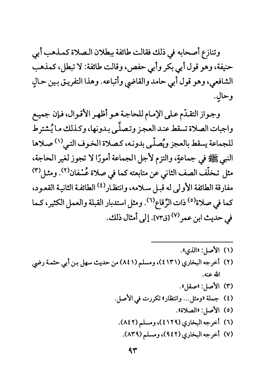 وجواز التقدّم على الإمام للحاجة هو أظهر الأقوال، فإن جميع واجبات الصلاة تسقط عند العجز وتصلَّى بدونها، وكذلك ما يُشترط للجماعة يسقط بالعجز ويُصلّى بدونه، كصلاة الخوف التي (¬١) صلاها النبي - صلى الله عليه وسلم - في جماعةٍ، والتزم لأجل الجماعة أمورًا لا تجوز لغير الحاجة، مثل تخلّف الصف الثاني عن متابعته كما في صلاة عُسْفان (¬٢). ومثل (¬٣) مفارقة الطائفة الأولى له قبل سلامه، وانتظار (¬٤) الطائفة الثانية القعود، كما في صلاة (¬٥) ذات الرِّقاع (¬٦). ومثل استدبار القبلة والعمل الكثير، كما في حديث ابن عمر (¬٧) [ق ٧٣]. إلى أمثال ذلك.