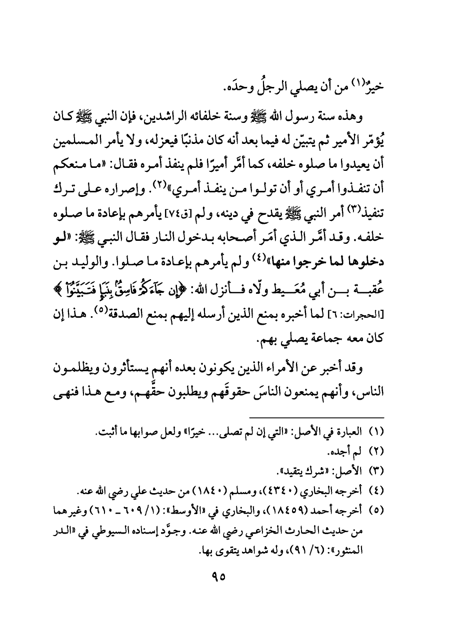 وهذه سنة رسول الله - صلى الله عليه وسلم - وسنة خلفائه الراشدين، فإن النبي - صلى الله عليه وسلم - كان يُؤمّر الأمير ثم يتبيّن له فيما بعد أنه كان مذنبًا فيعزله، ولا يأمر المسلمين أن يعيدوا ما صلوه خلفه، كما أمَّر أميرًا فلم ينفذ أمره فقال: «ما منعكم أن تنفذوا أمري أو أن تولوا من ينفذ أمري» (¬٢). وإصراره على ترك تنفيذ (¬٣) أمر النبي - صلى الله عليه وسلم - يقدح في دينه، ولم [ق ٧٤] يأمرهم بإعادة ما صلوه خلفه. وقد أمَّر الذي أمَر أصحابه بدخول النار فقال النبي - صلى الله عليه وسلم -: «لو دخلوها لما خرجوا منها» (¬٤) ولم يأمرهم بإعادة ما صلوا. والوليد بن عُقبة بن أبي مُعَيط ولّاه فأنزل الله: {إِنْ جَاءَكُمْ فَاسِقٌ بِنَبَإٍ فَتَبَيَّنُوا} [الحجرات: ٦] لما أخبره بمنع الذين أرسله إليهم بمنع الصدقة (¬٥). هذا إن كان معه جماعة يصلي بهم.