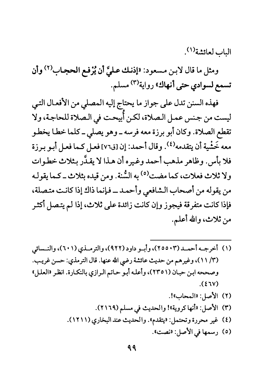 فهذه السنن تدل على جواز ما يحتاج إليه المصلي من الأفعال التي ليست من جنس عمل الصلاة، لكن أُبيحت في الصلاة للحاجة، ولا تقطع الصلاة. وكان أبو برزة معه فرسه ــ وهو يصلي ــ كلما خطا يخطو معه خَشْية أن يتقدمه (¬٤). وقال أحمد: إن [ق ٧٦] فعل كما فعل أبو برزة فلا بأس. وظاهر مذهب أحمد وغيره أن هذا لا يقدَّر بثلاث خطوات ولا ثلاث فعلات، كما مضت (¬٥) به السُّنة. ومن قيده بثلاث ــ كما يقوله من يقوله من أصحاب الشافعي وأحمد ــ فإنما ذاك إذا كانت متصلة، فإذا كانت متفرقة فيجوز وإن كانت زائدة على ثلاث، إذا لم يتصل أكثر من ثلاث، والله أعلم.