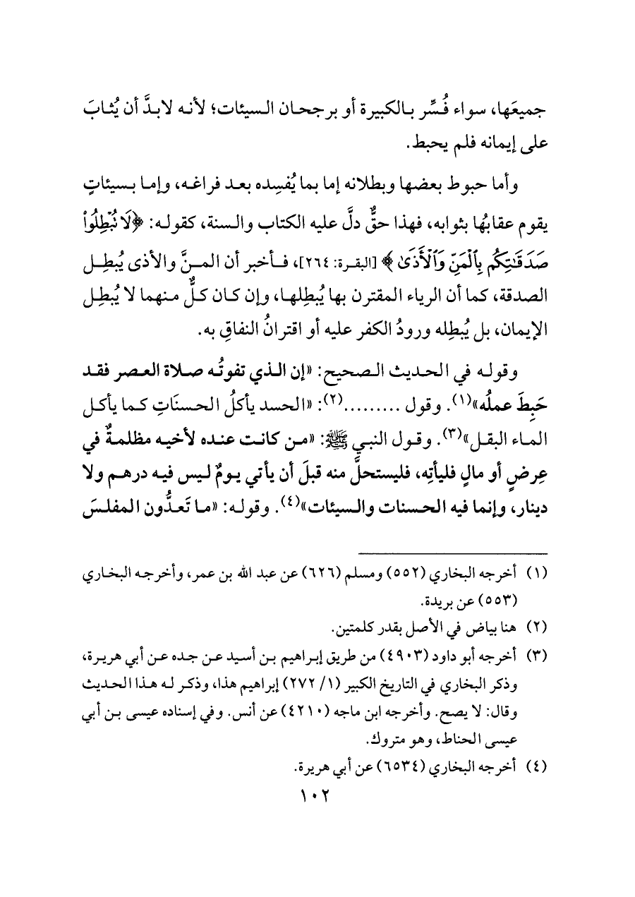 وأما حبوط بعضها وبطلانه إما بما يُفسِده بعد فراغه، وإما بسيئاتٍ يقوم عقابُها بثوابه، فهذا حقٌّ دلَّ عليه الكتاب والسنة، كقوله: {لَا تُبْطِلُوا صَدَقَاتِكُمْ بِالْمَنِّ وَالْأَذَى} [البقرة: ٢٦٤]، فأخبر أن المنَّ والأذى يُبطِل الصدقة، كما أن الرياء المقترن بها يُبطِلها، وإن كان كلٌّ منهما لا يُبطِل الإيمان، بل يُبطِله ورودُ الكفر عليه أو اقترانُ النفاقِ به.
