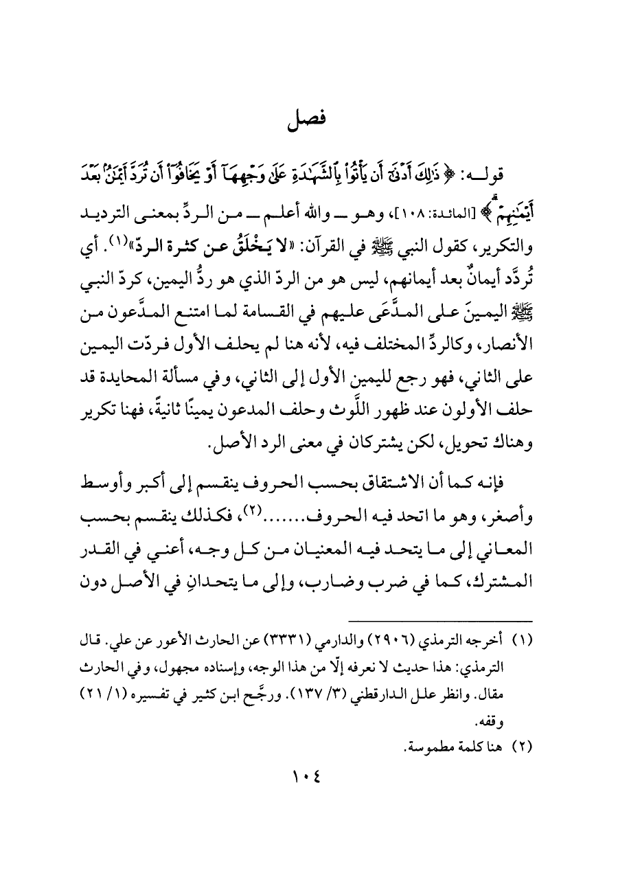 قوله: {ذَلِكَ أَدْنَى أَنْ يَأْتُوا بِالشَّهَادَةِ عَلَى وَجْهِهَا أَوْ يَخَافُوا أَنْ تُرَدَّ أَيْمَانٌ بَعْدَ أَيْمَانِهِمْ} [المائدة: ١٠٨]، وهو ــ والله أعلم ــ من الردِّ بمعنى الترديد والتكرير، كقول النبي - صلى الله عليه وسلم - في القرآن: «لا يَخْلَقُ عن كثرة الردّ» (¬١). أي تُردَّد أيمانٌ بعد أيمانهم، ليس هو من الردّ الذي هو ردُّ اليمين، كردّ النبي - صلى الله عليه وسلم - اليمينَ على المدَّعَى عليهم في القسامة لما امتنع المدَّعون من الأنصار، وكالردِّ المختلف فيه، لأنه هنا لم يحلف الأول فردّت اليمين على الثاني، فهو رجع لليمين الأول إلى الثاني، وفي مسألة المحايدة قد حلف الأولون عند ظهور اللَّوث وحلف المدعون يمينًا ثانيةً، فهنا تكرير وهناك تحويل، لكن يشتركان في معنى الرد الأصل.