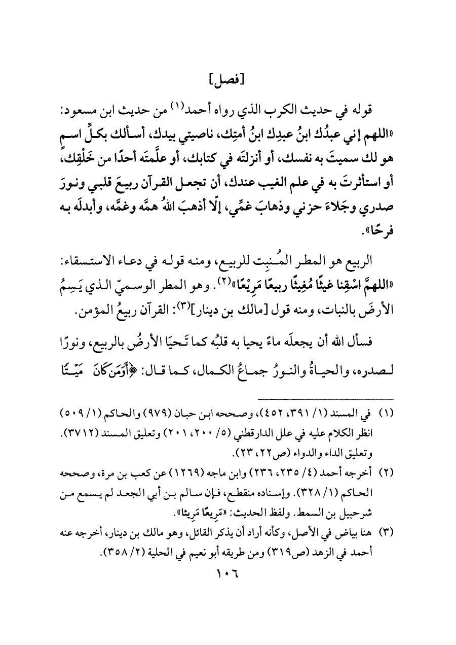 قوله في حديث الكرب الذي رواه أحمد (¬١) من حديث ابن مسعود: «اللهم إني عبدُك ابنُ عبدِك ابنُ أمتِك، ناصيتي بيدك، أسألك بكلِّ اسمٍ هو لك سميتَ به نفسك، أو أنزلتَه في كتابك، أو علَّمتَه أحدًا من خَلْقِك، أو استأثرتَ به في علم الغيب عندك، أن تجعل القرآن ربيعَ قلبي ونورَ صدري وجَلاءَ حزني وذهابَ غمِّي، إلّا أذهبَ اللهُ همَّه وغمَّه، وأبدلَه به فرحًا».