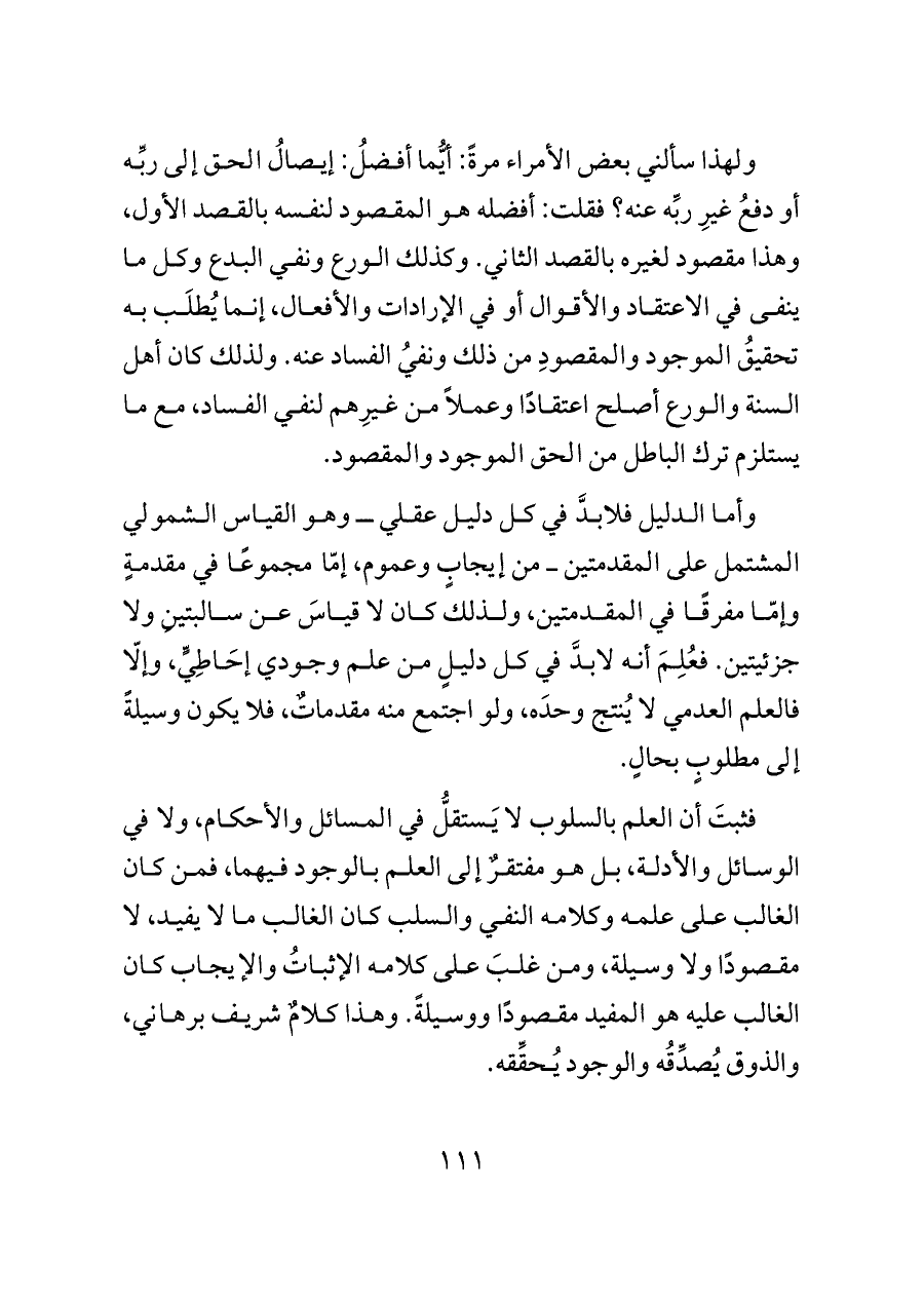 ولهذا سألني بعض الأمراء مرةً: أيُّما أفضلُ: إيصالُ الحق إلى ربِّه أو دفعُ غيرِ ربِّه عنه؟ فقلت: أفضله هو المقصود لنفسه بالقصد الأول، وهذا مقصود لغيره بالقصد الثاني. وكذلك الورع ونفي البدع وكل ما ينفى في الاعتقاد والأقوال أو في الإرادات والأفعال، إنما يُطلَب به تحقيقُ الموجود والمقصودِ من ذلك ونفيُ الفساد عنه. ولذلك كان أهل السنة والورع أصلح اعتقادًا وعملاً من غيرِهم لنفي الفساد، مع ما يستلزم ترك الباطل من الحق الموجود والمقصود.