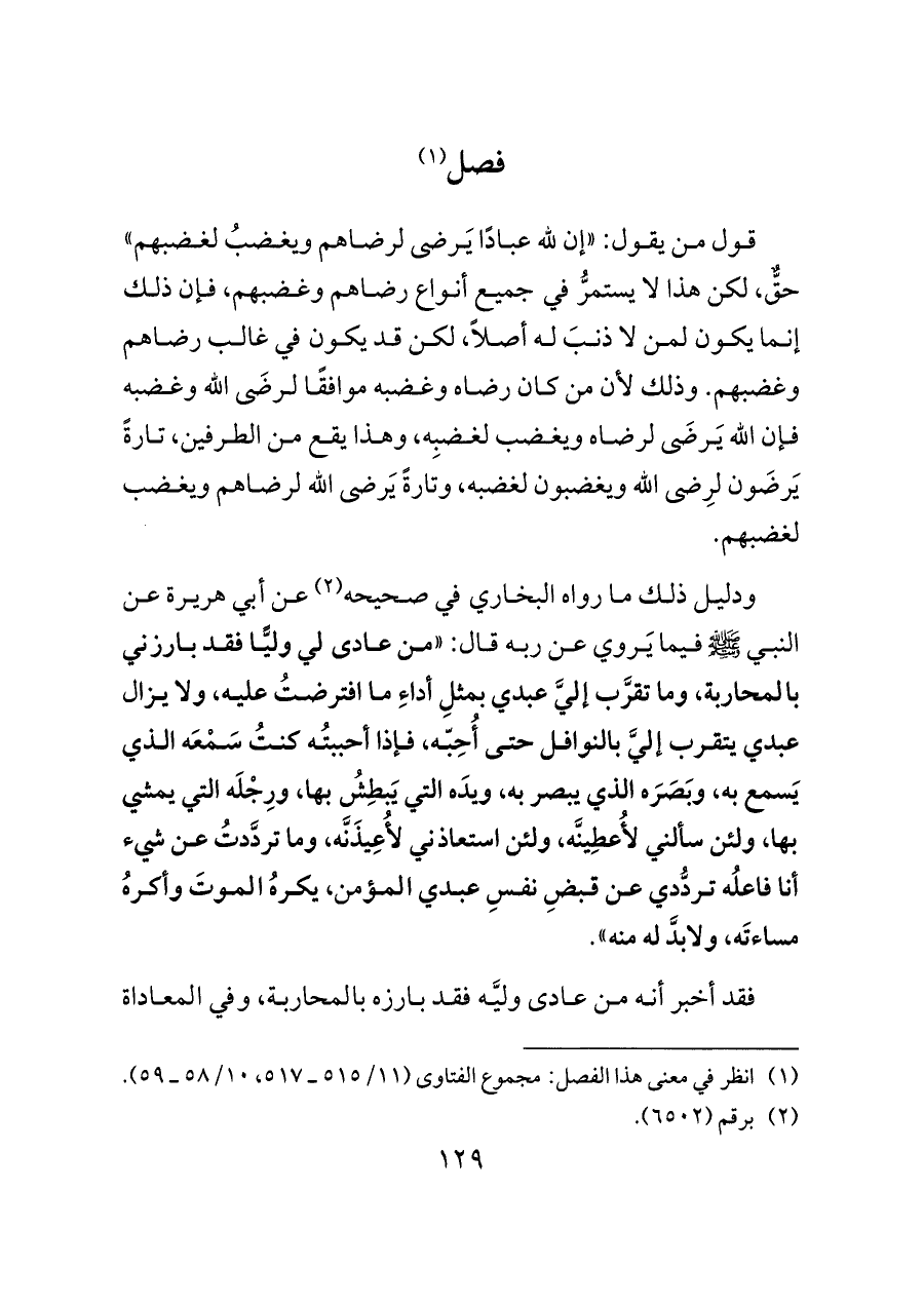 قول من يقول: «إن لله عبادًا يَرضى لرضاهم ويغضبُ لغضبهم» حقٌّ، لكن هذا لا يستمرُّ في جميع أنواع رضاهم وغضبهم، فإن ذلك إنما يكون لمن لا ذنبَ له أصلاً، لكن قد يكون في غالب رضاهم وغضبهم. وذلك لأن من كان رضاه وغضبه موافقًا لرضَى الله وغضبه فإن الله يَرضَى لرضاه ويغضب لغضبِه، وهذا يقع من الطرفين، تارةً يَرضَون لرِضى الله ويغضبون لغضبه، وتارةً يَرضى الله لرضاهم ويغضب لغضبهم.