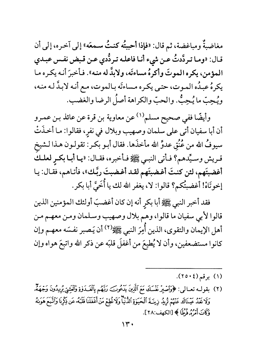 وأيضًا ففي صحيح مسلم (¬١) عن معاوية بن قرة عن عائذ بن عمرو أن أبا سفيان أتى على سلمان وصهيب وبلال في نفرٍ، فقالوا: ما أخذَتْ سيوفُ الله من عُنُقِ عدوِّ الله مأخذَها. فقال أبو بكر: تقولون هذا لشيخِ قريش وسيِّدهم؟ فأتى النبي - صلى الله عليه وسلم - فأخبره، فقال: «يا أبا بكرٍ لعلك أغضبتَهم، لئن كنتَ أغضبتَهم لقد أغضبتَ ربَّك»، فأتاهم، فقال: يا إخوتَاهْ! أغضبتُكم؟ قالوا: لا، يغفر الله لك يا أُخَيَّ أبا بكر.
