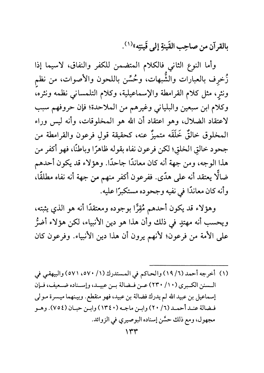 وأما النوع الثاني فالكلام المتضمن للكفر والنفاق، لاسيما إذا زُخرِف بالعبارات والشُّبهات، وحُسِّن باللحون والأصوات، من نظمٍ ونثرٍ، مثل كلام القرامطة والإسماعيلية، وكلام التلمساني نظمه ونثره، وكلام ابن سبعين والبلياني وغيرهم من الملاحدة؛ فإن حروفهم سبب لاعتقاد الضلال، وهو اعتقاد أن الله هو المخلوقات، وأنه ليس وراء المخلوق خالقٌ خَلَقَه متميزٌ عنه، كحقيقة قولِ فرعون والقرامطة من جحود خالقِ الخلقِ؛ لكن فرعون نفاه بقوله ظاهرًا وباطنًا، فهو أكفر من هذا الوجه، ومن جهة أنه كان معاندًا جاحدًا. وهؤلاء قد يكون أحدهم ضالًّا يعتقد أنه على هدًى. ففرعون أكفر منهم من جهة أنه نفاه مطلقًا، وأنه كان معاندًا في نفيه وجحوده مستكبرًا عليه.