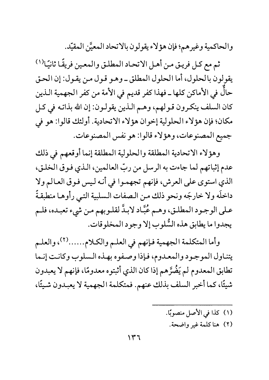 ثم مع كل فريق من أهل الاتحاد المطلق والمعين فريقًا ثانيًا (¬١) يقولون بالحلول، أما الحلول المطلق ــ وهو قول من يقول: إن الحق حالٌّ في الأماكن كلها ــ فهذا كفر قديم في الأمة من كفر الجهمية الذين كان السلف ينكرون قولهم، وهم الذين يقولون: إن الله بذاته في كل مكان؛ فإن هؤلاء الحلولية إخوان هؤلاء الاتحادية. أولئك قالوا: هو في جميع المصنوعات، وهؤلاء قالوا: هو نفس المصنوعات.
