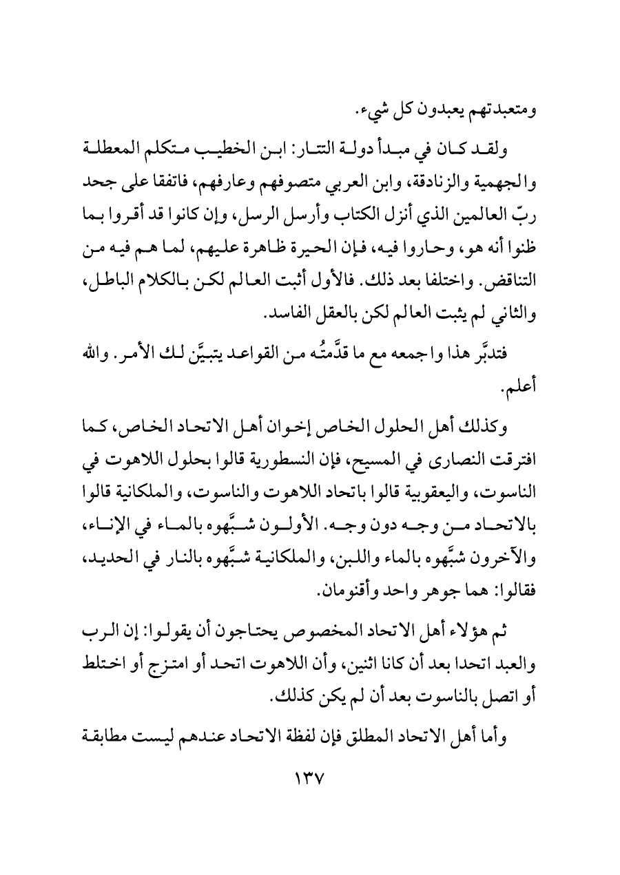 ثم هؤلاء أهل الاتحاد المخصوص يحتاجون أن يقولوا: إن الرب والعبد اتحدا بعد أن كانا اثنين، وأن اللاهوت اتحد أو امتزج أو اختلط أو اتصل بالناسوت بعد أن لم يكن كذلك.