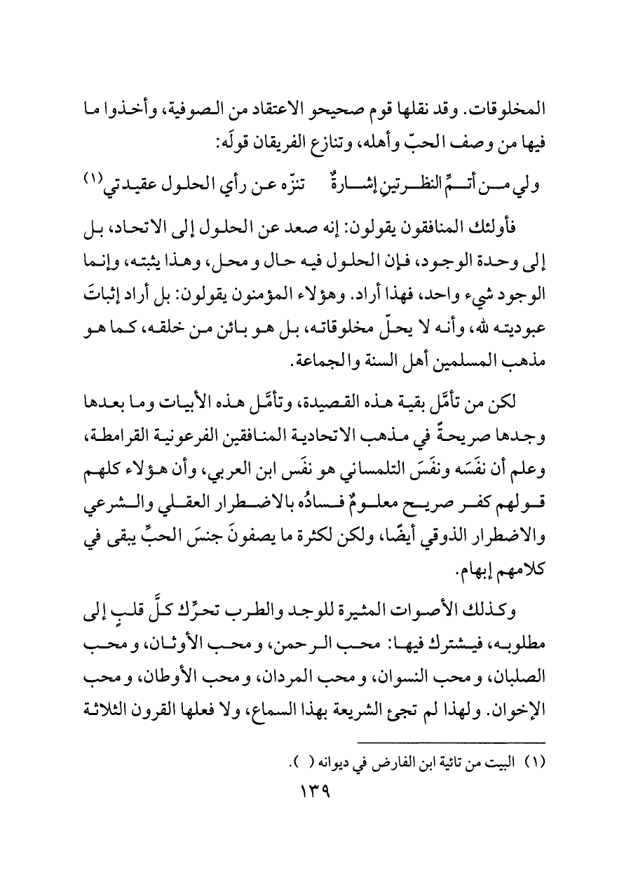 لكن من تأمَّل بقية هذه القصيدة، وتأمَّل هذه الأبيات وما بعدها وجدها صريحةً في مذهب الاتحادية المنافقين الفرعونية القرامطة، وعلم أن نفَسَه ونفَسَ التلمساني هو نفَس ابن العربي، وأن هؤلاء كلهم قولهم كفر صريح معلومٌ فسادُه بالاضطرار العقلي والشرعي والاضطرار الذوقي أيضًا، ولكن لكثرة ما يصفونَ جنسَ الحبِّ يبقى في كلامهم إبهام.