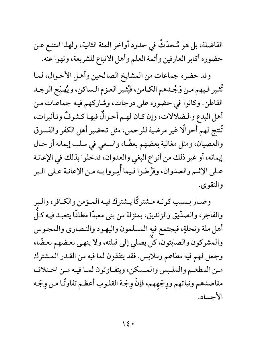 وقد حضره جماعات من المشايخ الصالحين وأهل الأحوال، لما تُثير فيهم من وَجْدهم الكامن، فيُثير العزم الساكن، ويُهيّج الوجد القاطن. وكانوا في حضوره على درجات، وشاركهم فيه جماعات من أهل البدع والضلالات، وإن كان لهم أحوالٌ فيها كشوفٌ وتأثيرات، تُنتج لهم أحوالًا غير مرضية للرحمن، مثل تحضير أهل الكفر والفسوق والعصيان، ومثل مغالبة بعضهم بعضًا، والسعي في سلب إيمانه أو حال إيمانه، أو غير ذلك من أنواع البغي والعدوان، فدخلوا بذلك في الإعانة على الإثم والعدوان، وفرَّطوا فيما أُمِروا به من الإعانة على البر والتقوى.