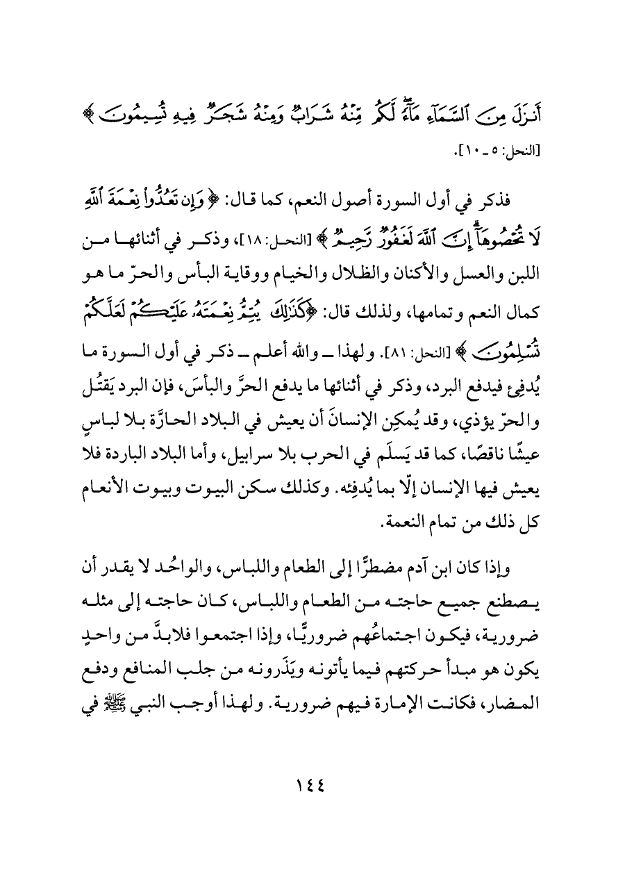 فذكر في أول السورة أصول النعم، كما قال: {وَإِنْ تَعُدُّوا نِعْمَةَ اللَّهِ لَا تُحْصُوهَا إِنَّ اللَّهَ لَغَفُورٌ رَحِيمٌ} [النحل: ١٨]، وذكر في أثنائها من اللبن والعسل والأكنان والظلال والخيام ووقاية البأس والحرّ ما هو كمال النعم وتمامها، ولذلك قال: {كَذَلِكَ يُتِمُّ نِعْمَتَهُ عَلَيْكُمْ لَعَلَّكُمْ تُسْلِمُونَ} [النحل: ٨١]. ولهذا ــ والله أعلم ــ ذكر في أول السورة ما يُدفِئ فيدفع البرد، وذكر في أثنائها ما يدفع الحرَّ والبأسَ، فإن البرد يَقتُل والحرّ يؤذي، وقد يُمكِن الإنسانَ أن يعيش في البلاد الحارَّة بلا لباسٍ عيشًا ناقصًا، كما قد يَسلَم في الحرب بلا سرابيل، وأما البلاد الباردة فلا يعيش فيها الإنسان إلّا بما يُدفِئه. وكذلك سكن البيوت وبيوت الأنعام كل ذلك من تمام النعمة.
