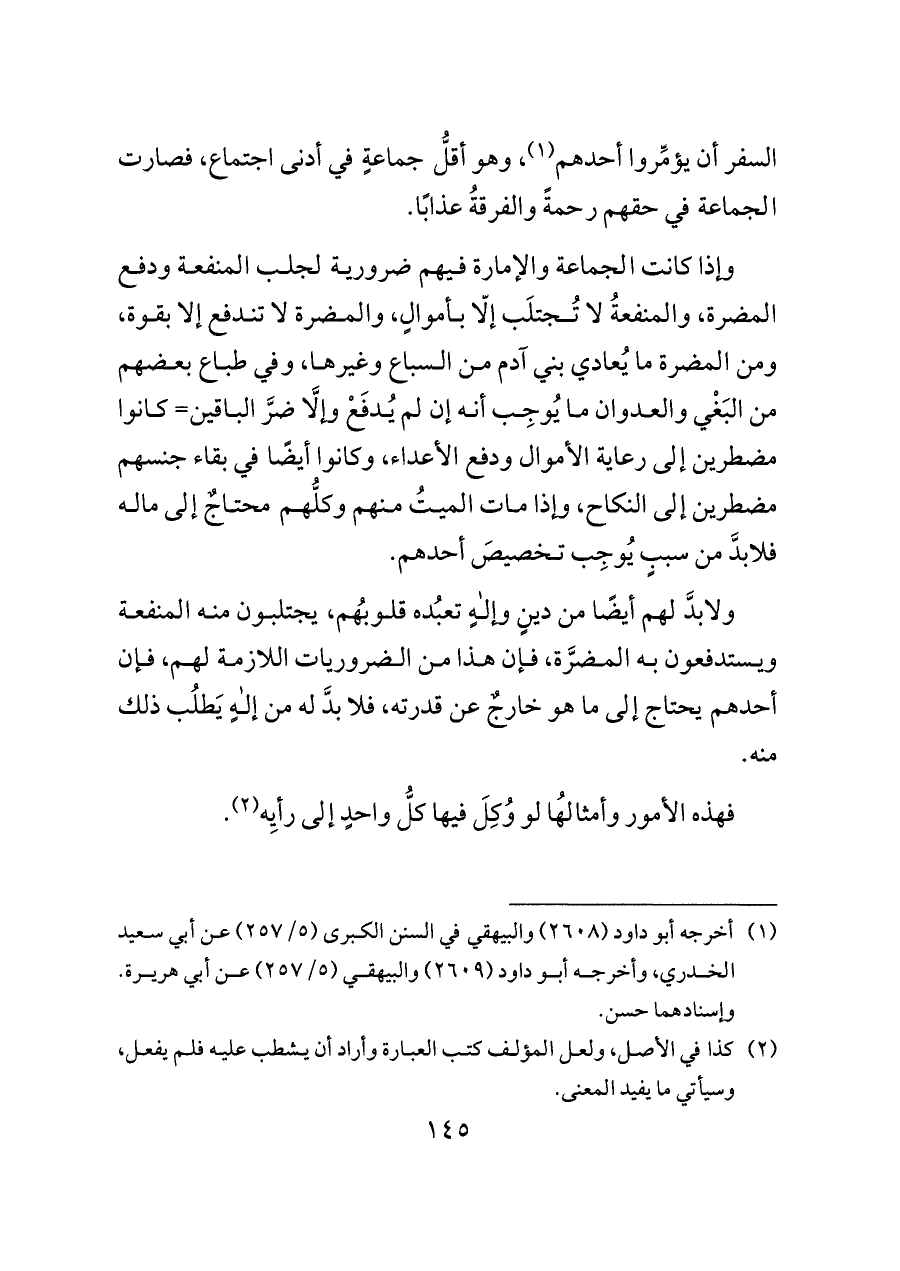 السفر أن يؤمِّروا أحدهم (¬١)، وهو أقلُّ جماعةٍ في أدنى اجتماع، فصارت الجماعة في حقهم رحمةً والفرقةُ عذابًا.