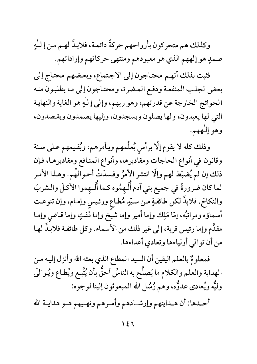 وذلك كله لا يقوم إلّا برأسٍ يُعلِّمهم ويأمرهم، ويُقيمهم على سنة وقانون في أنواع الحاجات ومقاديرها، وأنواع المنافع ومقاديرها، فإن ذلك إن لم يُضبَط لهم وإلّا انتشر الأمرُ وفسدَتْ أحوالُهم. وهذا الأمر لما كان ضرورةً في جميع بني آدم أُلْهِمُوه كما أُلْهِموا الأكلَ والشربَ والنكاحَ. فلابدَّ لكل طائفةٍ من سيّدٍ مُطاعٍ ورئيسٍ وإمام، وإن تنوعت أسماؤه ومراتبُه، إمّا مَلِك وإما أمير وإما شيخ وإما مُفتٍ وإما قاضٍ وإما مقدَّم وإما رئيس قرية، إلى غير ذلك من الأسماء. وكل طائفة فلابدَّ لها من أن توالي أولياءها وتعادي أعداءها.