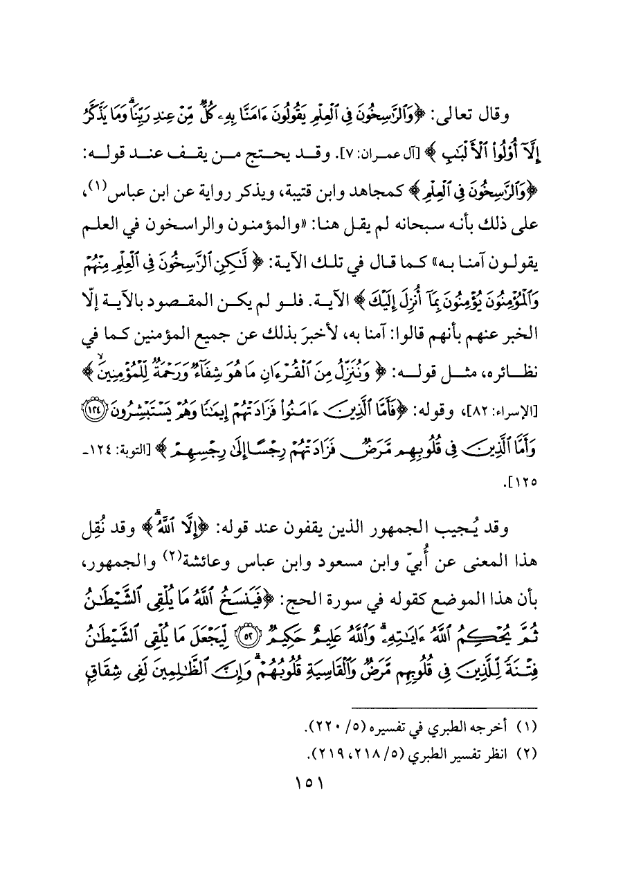 وقد يُجيب الجمهور الذين يقفون عند قوله: {إِلَّا اللَّهُ} وقد نُقِل هذا المعنى عن أُبيّ وابن مسعود وابن عباس وعائشة (¬٢) والجمهور، بأن هذا الموضع كقوله في سورة الحج: {فَيَنْسَخُ اللَّهُ مَا يُلْقِي الشَّيْطَانُ ثُمَّ يُحْكِمُ اللَّهُ آيَاتِهِ وَاللَّهُ عَلِيمٌ حَكِيمٌ (٥٢) لِيَجْعَلَ مَا يُلْقِي الشَّيْطَانُ فِتْنَةً لِلَّذِينَ فِي قُلُوبِهِمْ مَرَضٌ وَالْقَاسِيَةِ قُلُوبُهُمْ وَإِنَّ الظَّالِمِينَ لَفِي شِقَاقٍ