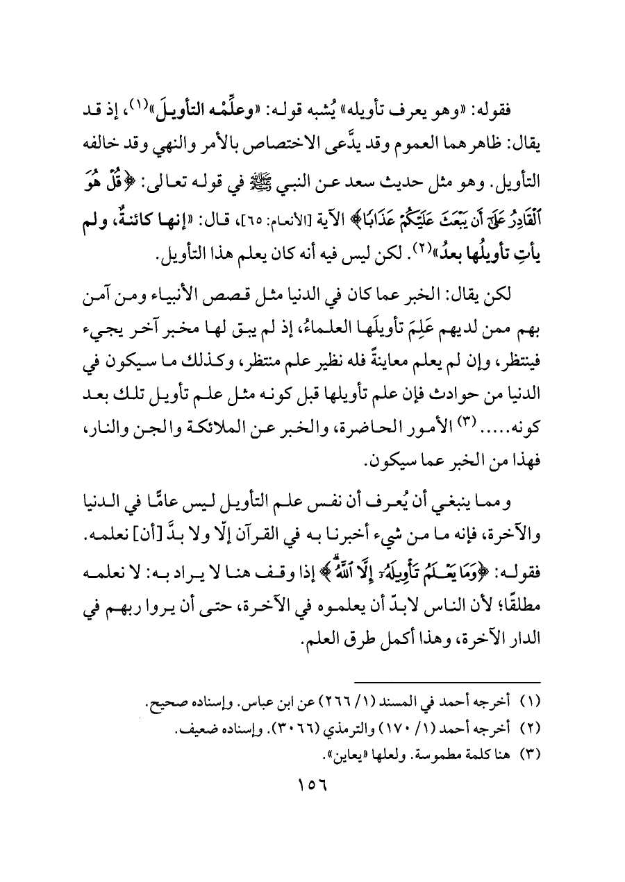 فقوله: "وهو يعرف تأويله" يُشبه قوله: "وعلِّمْه التأويلَ" (¬١)، إذ قد يقال: ظاهرهما العموم وقد يدَّعى الاختصاص بالأمر والنهي وقد خالفه التأويل. وهو مثل حديث سعد عن النبي - صلى الله عليه وسلم - في قوله تعالى: {قُلْ هُوَ الْقَادِرُ عَلَى أَنْ يَبْعَثَ عَلَيْكُمْ عَذَابًا} الآية [الأنعام: ٦٥]، قال: "إنها كائنةٌ، ولم يأتِ تأويلُها بعدُ" (¬٢). لكن ليس فيه أنه كان يعلم هذا التأويل.