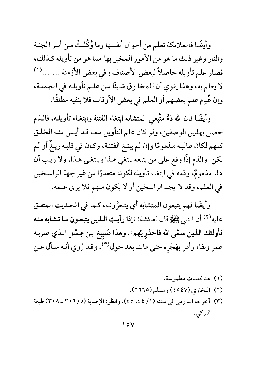 وأيضًا فإن الله ذمَّ متَّبعي المتشابه ابتغاء الفتنة وابتغاء تأويله، فالذم حصل بهذين الوصفين، ولو كان علم التأويل مما قد أيس منه الخلق كلهم لكان طالبه مذمومًا وإن لم يبتغ الفتنة، وكان في قلبه زيغٌ أو لم يكن. والذم إذًا وقع على من يتبعه يبتغي هذا ويبتغي هذا، ولا ريب أن هذا مذمومٌ، وذمه في ابتغاء تأويله لكونه متعذرًا من غير جهة الراسخين في العلم، وقد لا يجد الراسخين أو لا يكون منهم فلا يرى علمه.