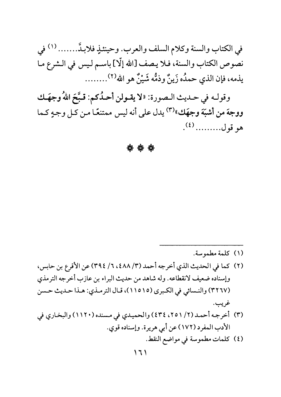 وقوله في حديث الصورة: "لا يقولن أحدُكم: قبَّحَ اللهُ وجهَك ووجهَ من أشبَهَ وجهَك" (¬٣) يدل على أنه ليس ممتنعًا من كل وجهٍ كما هو قول ......... (¬٤).