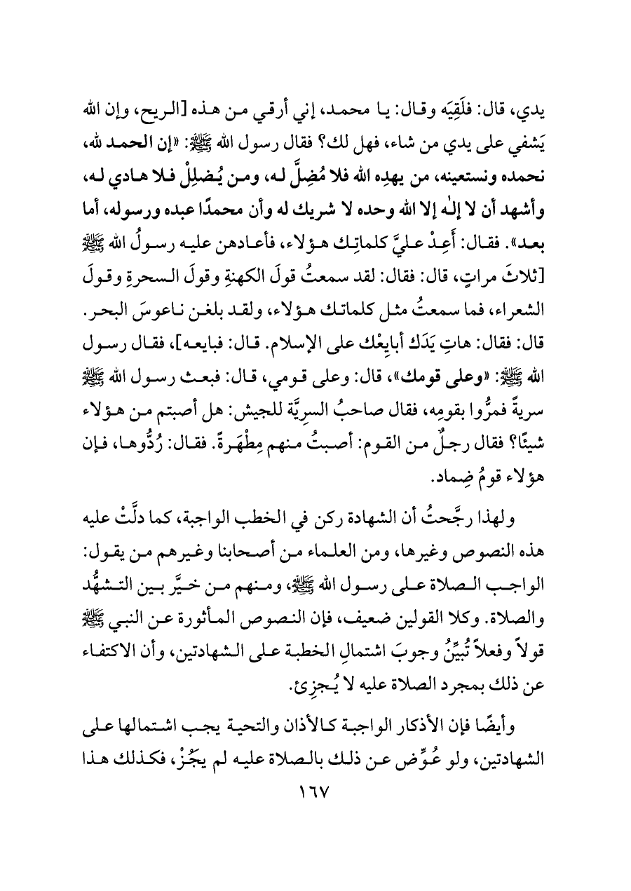 ولهذا رجَّحتُ أن الشهادة ركن في الخطب الواجبة، كما دلَّتْ عليه هذه النصوص وغيرها، ومن العلماء من أصحابنا وغيرهم من يقول: الواجب الصلاة على رسول الله - صلى الله عليه وسلم -، ومنهم من خيَّر بين التشهُّد والصلاة. وكلا القولين ضعيف، فإن النصوص المأثورة عن النبي - صلى الله عليه وسلم - قولاً وفعلاً تُبيِّنُ وجوبَ اشتمالِ الخطبة على الشهادتين، وأن الاكتفاء عن ذلك بمجرد الصلاة عليه لا يُجزِئ.