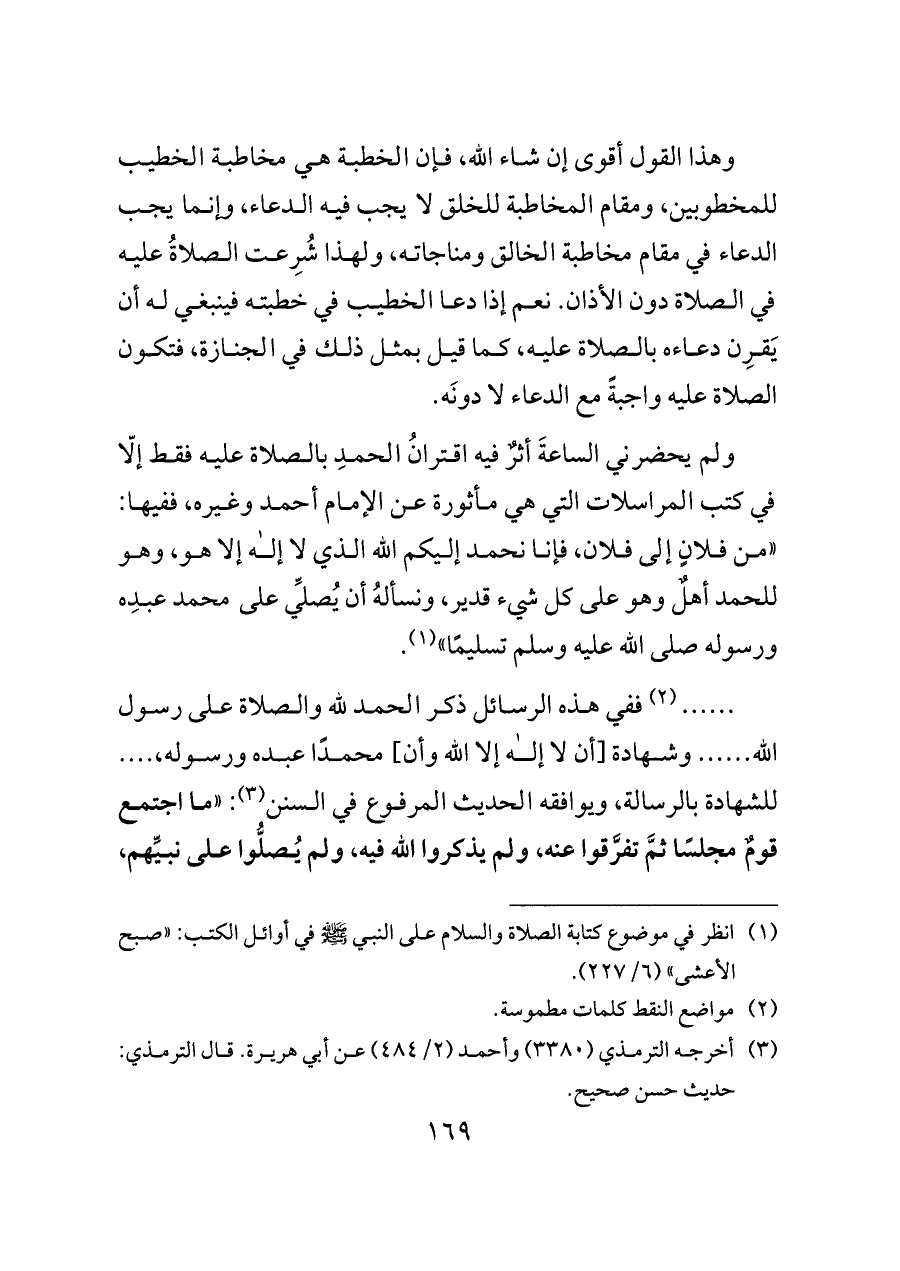 ... (¬٢) ففي هذه الرسائل ذكر الحمد لله والصلاة على رسول الله ...... وشهادة [أن لا إله إلا الله وأن] محمدًا عبده ورسوله، .... للشهادة بالرسالة، ويوافقه الحديث المرفوع في السنن (¬٣): "ما اجتمع قومٌ مجلسًا ثمَّ تفرَّقوا عنه، ولم يذكروا الله فيه، ولم يُصلُّوا على نبيِّهم،
