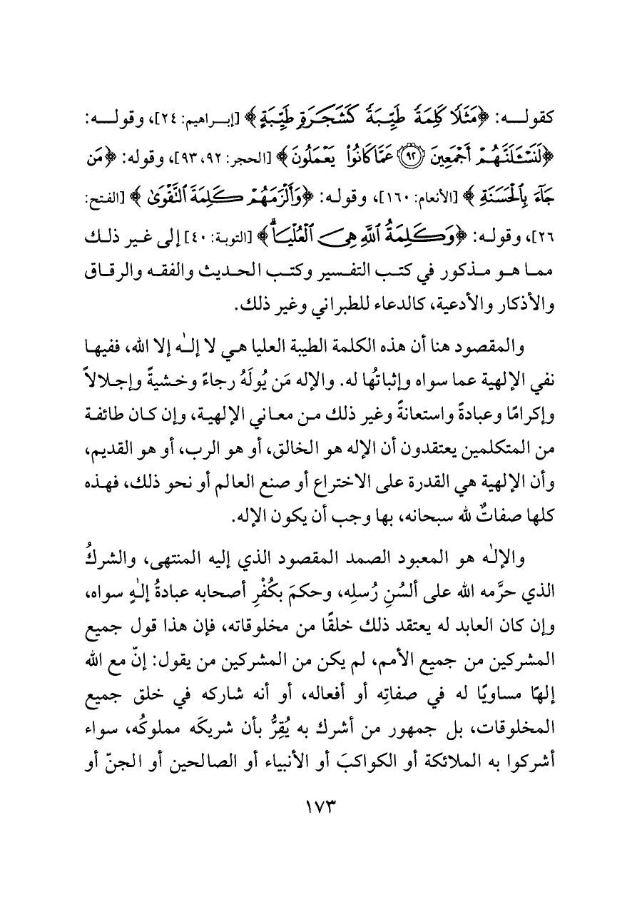 والمقصود هنا أن هذه الكلمة الطيبة العليا هي لا إله إلا الله، ففيها نفي الإلهية عما سواه وإثباتُها له. والإله مَن يُولَهُ رجاءً وخشيةً وإجلالاً وإكرامًا وعبادةً واستعانةً وغير ذلك من معاني الإلهية، وإن كان طائفة من المتكلمين يعتقدون أن الإله هو الخالق، أو هو الرب، أو هو القديم، وأن الإلهية هي القدرة على الاختراع أو صنع العالم أو نحو ذلك، فهذه كلها صفاتٌ لله سبحانه، بها وجب أن يكون الإله.