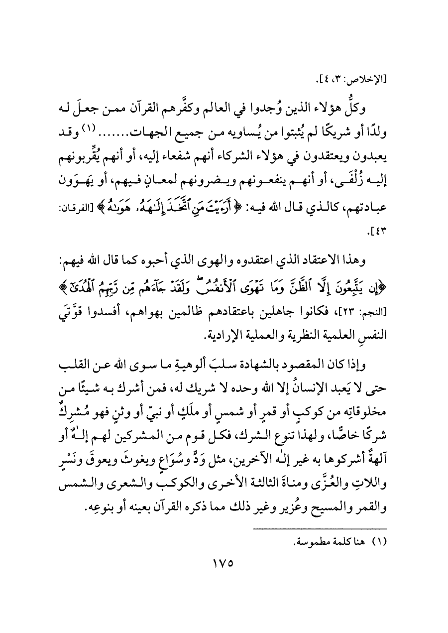 وكلُّ هؤلاء الذين وُجدوا في العالم وكفَّرهم القرآن ممن جعلَ له ولدًا أو شريكًا لم يُثبتوا من يُساويه من جميع الجهات ....... (¬١) وقد يعبدون ويعتقدون في هؤلاء الشركاء أنهم شفعاء إليه، أو أنهم يُقِّربونهم إليه زُلْفَى، أو أنهم ينفعونهم ويضرونهم لمعانٍ فيهم، أو يَهوَون عبادتهم، كالذي قال الله فيه: {أَرَأَيْتَ مَنِ اتَّخَذَ إِلَهَهُ هَوَاهُ} [الفرقان: ٤٣].