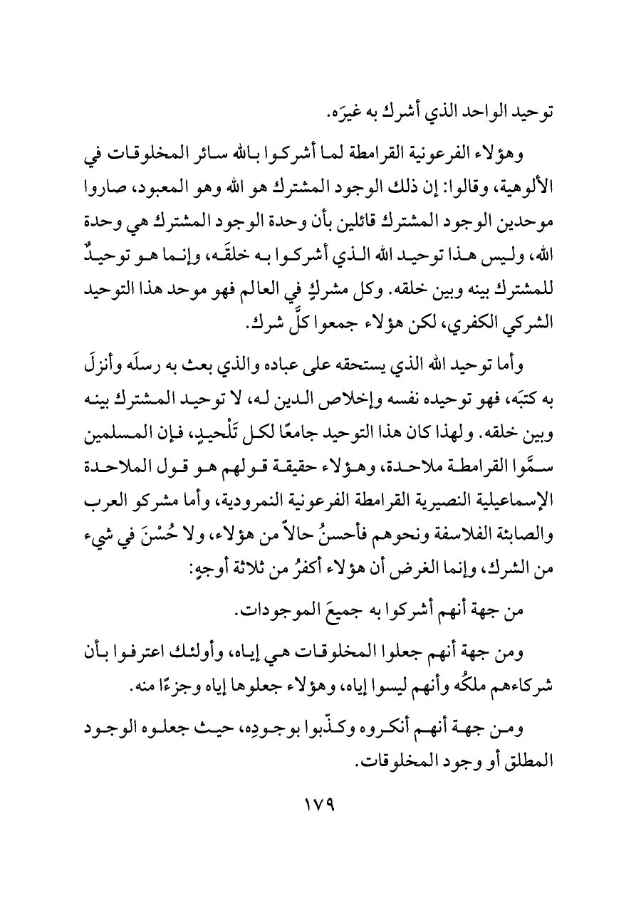 وأما توحيد الله الذي يستحقه على عباده والذي بعث به رسلَه وأنزلَ به كتبَه، فهو توحيده نفسه وإخلاص الدين له، لا توحيد المشترك بينه وبين خلقه. ولهذا كان هذا التوحيد جامعًا لكل تَلْحيدٍ، فإن المسلمين سمَّوا القرامطة ملاحدة، وهؤلاء حقيقة قولهم هو قول الملاحدة الإسماعيلية النصيرية القرامطة الفرعونية النمرودية، وأما مشركو العرب والصابئة الفلاسفة ونحوهم فأحسنُ حالاً من هؤلاء، ولا حُسْنَ في شيء من الشرك، وإنما الغرض أن هؤلاء أكفرُ من ثلاثة أوجهٍ: