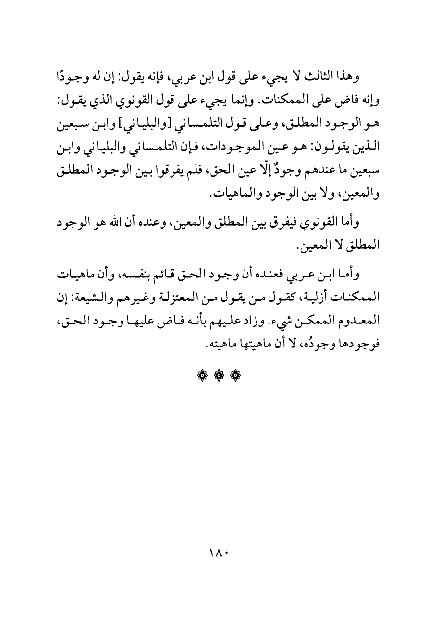 وهذا الثالث لا يجيء على قول ابن عربي، فإنه يقول: إن له وجودًا وإنه فاض على الممكنات. وإنما يجيء على قول القونوي الذي يقول: هو الوجود المطلق، وعلى قول التلمساني [والبلياني] وابن سبعين الذين يقولون: هو عين الموجودات، فإن التلمساني والبلياني وابن سبعين ما عندهم وجودٌ إلّا عين الحق، فلم يفرقوا بين الوجود المطلق والمعين، ولا بين الوجود والماهيات.