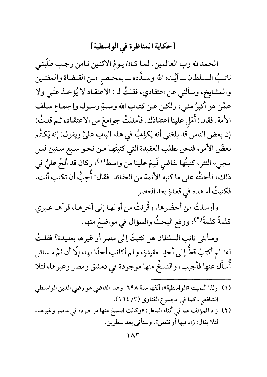 الحمد لله رب العالمين. لما كان يومُ الاثنين ثامن رجب طلَبني نائبُ السلطان ــ أيَّده الله وسدَّده ــ بمحضرٍ من القضاة والمفتين والمشايخ، وسألني عن اعتقادي، فقلتُ له: الاعتقاد لا يُؤخذ عنّي ولا عمَّن هو أكبرُ مني، ولكن عن كتاب الله وسنةِ رسوله وإجماع سلف الأمة. فقال: أَمْلِ علينا اعتقادَك. فأمللتُ جوامعَ من الاعتقاد، ثم قلتُ: إن بعض الناس قد بلغني أنه يَكذِبُ في هذا الباب عليَّ ويقول: إنه يَكتُم بعضَ الأمر، فنحن نطلب العقيدة التي كتبتُها من نحو سبع سنين قبل مجيء التتر، كتبتُها لقاضٍ قَدِمَ علينا من واسط (¬١)، وكان قد ألحَّ عليَّ في ذلك، فأحلتُه على ما كتبه الأئمة من العقائد. فقال: أُحِبُّ أن تكتب أنت، فكتبتُ له هذه في قعدةٍ بعد العصر.