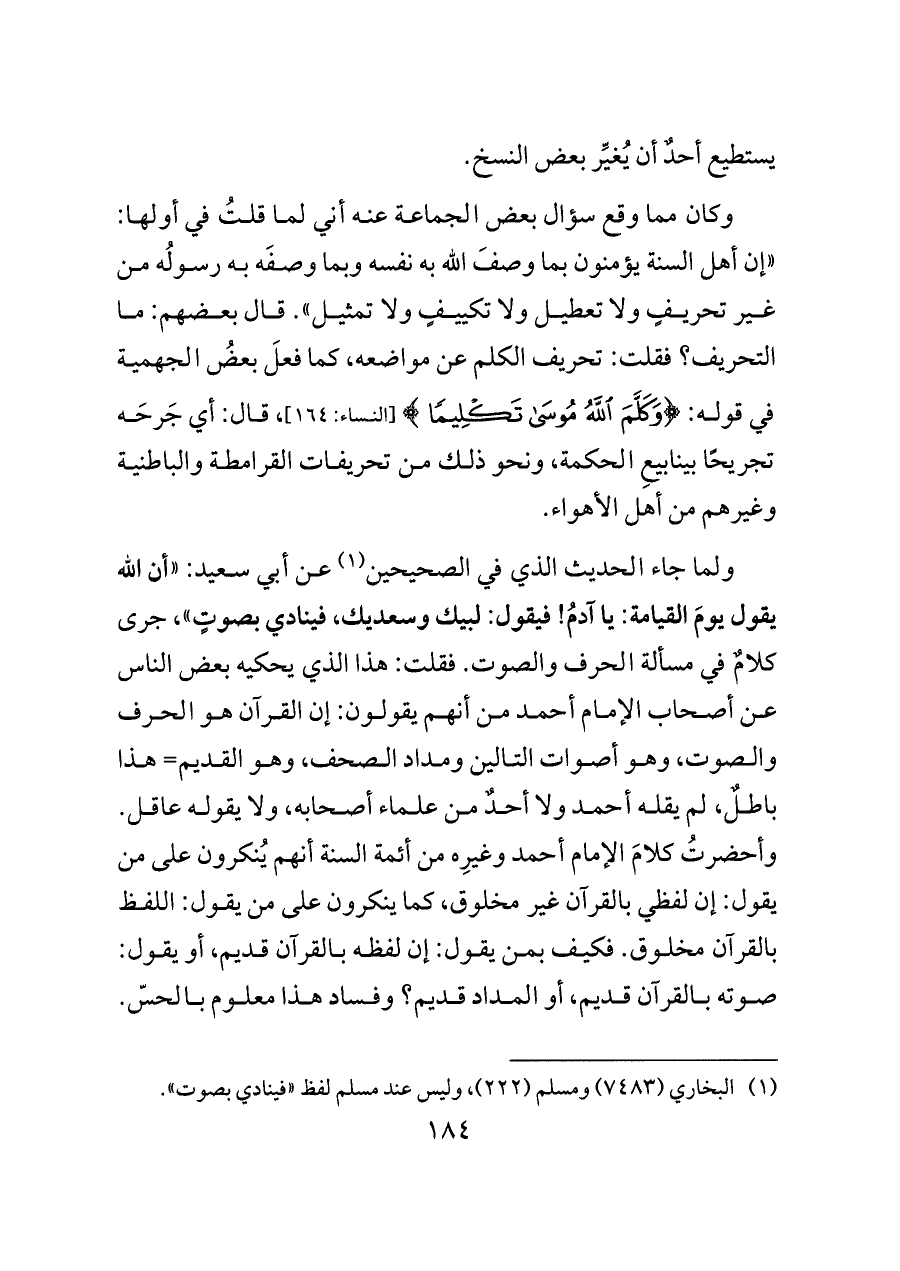 وكان مما وقع سؤال بعض الجماعة عنه أني لما قلتُ في أولها: «إن أهل السنة يؤمنون بما وصفَ الله به نفسه وبما وصفَه به رسولُه من غير تحريفٍ ولا تعطيل ولا تكييفٍ ولا تمثيل». قال بعضهم: ما التحريف؟ فقلت: تحريف الكلم عن مواضعه، كما فعلَ بعضُ الجهمية في قوله: {وَكَلَّمَ اللَّهُ مُوسَى تَكْلِيمًا} [النساء: ١٦٤]، قال: أي جَرحَه تجريحًا بينابيعِ الحكمة، ونحو ذلك من تحريفات القرامطة والباطنية وغيرهم من أهل الأهواء.