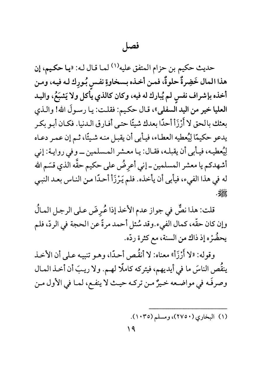 قلت: هذا نصٌّ في جواز عدم الأخذ إذا عُرِضَ على الرجل المالُ وإن كان حقّه، كمال الفيء. وقد سُئل أحمد مرةً عن الحجة في الردّ، فلم يحضُرْه إذ ذاك من السنة، مع كثرة ردّه.