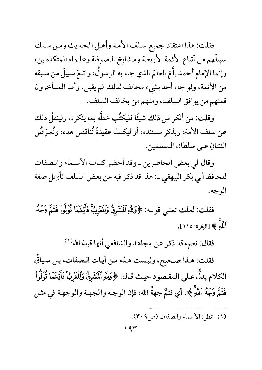 وقال لي بعض الحاضرين ــ وقد أحضر كتاب الأسماء والصفات للحافظ أبي بكر البيهقي ــ: هذا قد ذكر فيه عن بعض السلف تأويل صفة الوجه.