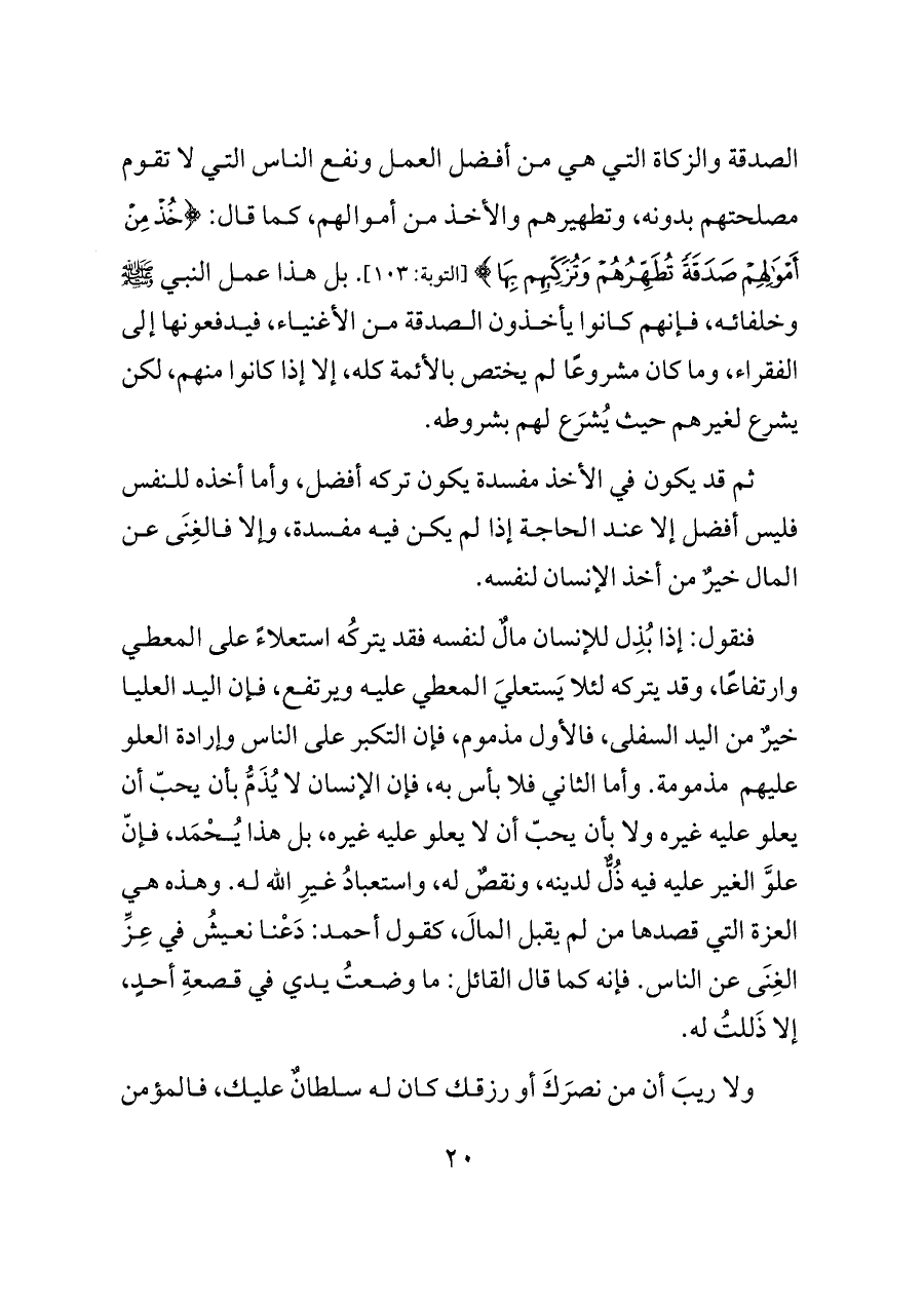 فنقول: إذا بُذِل للإنسان مالٌ لنفسه فقد يتركُه استعلاءً على المعطي وارتفاعًا، وقد يتركه لئلا يَستعليَ المعطي عليه ويرتفع، فإن اليد العليا خيرٌ من اليد السفلى، فالأول مذموم، فإن التكبر على الناس وإرادة العلو عليهم مذمومة. وأما الثاني فلا بأس به، فإن الإنسان لا يُذَمُّ بأن يحبّ أن يعلو عليه غيره ولا بأن يحبّ أن لا يعلو عليه غيره، بل هذا يُحْمَد، فإنّ علوَّ الغير عليه فيه ذُلٌّ لدينه، ونقصٌ له، واستعبادُ غيرِ الله له. وهذه هي العزة التي قصدها من لم يقبل المالَ، كقول أحمد: دَعْنا نعيشُ في عِزِّ الغِنَى عن الناس. فإنه كما قال القائل: ما وضعتُ يدي في قصعةِ أحدٍ، إلا ذَللتُ له.