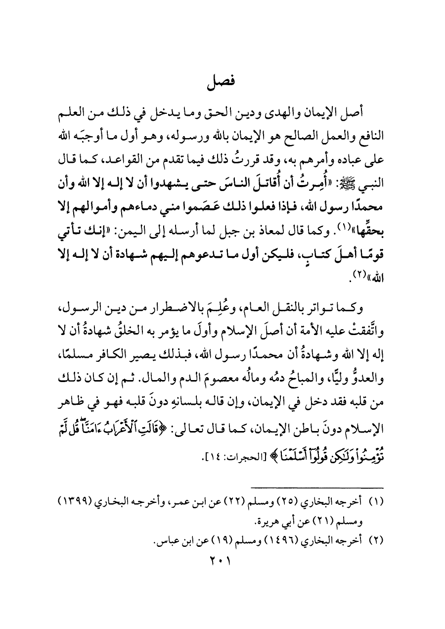أصل الإيمان والهدى ودين الحق وما يدخل في ذلك من العلم النافع والعمل الصالح هو الإيمان بالله ورسوله، وهو أول ما أوجبَه الله على عباده وأمرهم به، وقد قررتُ ذلك فيما تقدم من القواعد، كما قال النبي - صلى الله عليه وسلم -: «أُمِرتُ أن أُقاتلَ الناسَ حتى يشهدوا أن لا إله إلا الله وأن محمدًا رسول الله، فإذا فعلوا ذلك عَصَموا مني دماءهم وأموالهم إلا بحقِّها» (¬١). وكما قال لمعاذ بن جبل لما أرسله إلى اليمن: «إنك تأتي قومًا أهلَ كتابٍ، فليكن أول ما تدعوهم إليهم شهادة أن لا إله إلا الله» (¬٢).
