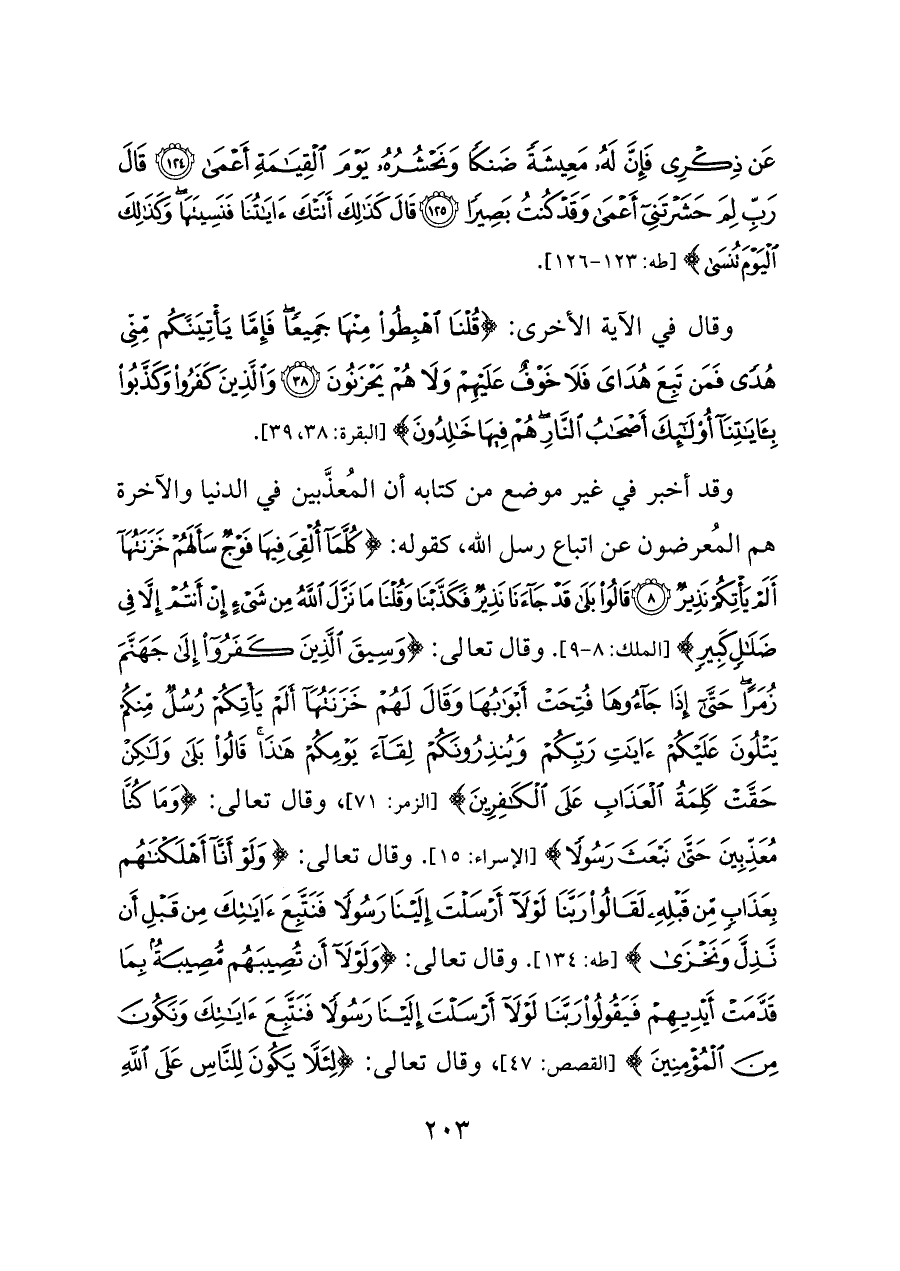 وقد أخبر في غير موضع من كتابه أن المُعذَّبين في الدنيا والآخرة هم المُعرضون عن اتباع رسل الله، كقوله: {كُلَّمَا أُلْقِيَ فِيهَا فَوْجٌ سَأَلَهُمْ خَزَنَتُهَا أَلَمْ يَأْتِكُمْ نَذِيرٌ (٨) قَالُوا بَلَى قَدْ جَاءَنَا نَذِيرٌ فَكَذَّبْنَا وَقُلْنَا مَا نَزَّلَ اللَّهُ مِنْ شَيْءٍ إِنْ أَنْتُمْ إِلَّا فِي ضَلَالٍ كَبِيرٍ} [الملك: ٨ - ٩]. وقال تعالى: {وَسِيقَ الَّذِينَ كَفَرُوا إِلَى جَهَنَّمَ زُمَرًا حَتَّى إِذَا جَاءُوهَا فُتِحَتْ أَبْوَابُهَا وَقَالَ لَهُمْ خَزَنَتُهَا أَلَمْ يَأْتِكُمْ رُسُلٌ مِنْكُمْ يَتْلُونَ عَلَيْكُمْ آيَاتِ رَبِّكُمْ وَيُنْذِرُونَكُمْ لِقَاءَ يَوْمِكُمْ هَذَا قَالُوا بَلَى وَلَكِنْ حَقَّتْ كَلِمَةُ الْعَذَابِ عَلَى الْكَافِرِينَ} [الزمر: ٧١]، وقال تعالى: {وَمَا كُنَّا مُعَذِّبِينَ حَتَّى نَبْعَثَ رَسُولًا} [الإسراء: ١٥]. وقال تعالى: {وَلَوْ أَنَّا أَهْلَكْنَاهُمْ بِعَذَابٍ مِنْ قَبْلِهِ لَقَالُوا رَبَّنَا لَوْلَا أَرْسَلْتَ إِلَيْنَا رَسُولًا فَنَتَّبِعَ آيَاتِكَ مِنْ قَبْلِ أَنْ نَذِلَّ وَنَخْزَى} [طه: ١٣٤]. وقال تعالى: {وَلَوْلَا أَنْ تُصِيبَهُمْ مُصِيبَةٌ بِمَا قَدَّمَتْ أَيْدِيهِمْ فَيَقُولُوا رَبَّنَا لَوْلَا أَرْسَلْتَ إِلَيْنَا رَسُولًا فَنَتَّبِعَ آيَاتِكَ وَنَكُونَ مِنَ الْمُؤْمِنِينَ} [القصص: ٤٧]، وقال تعالى: {لِئَلَّا يَكُونَ لِلنَّاسِ عَلَى اللَّهِ